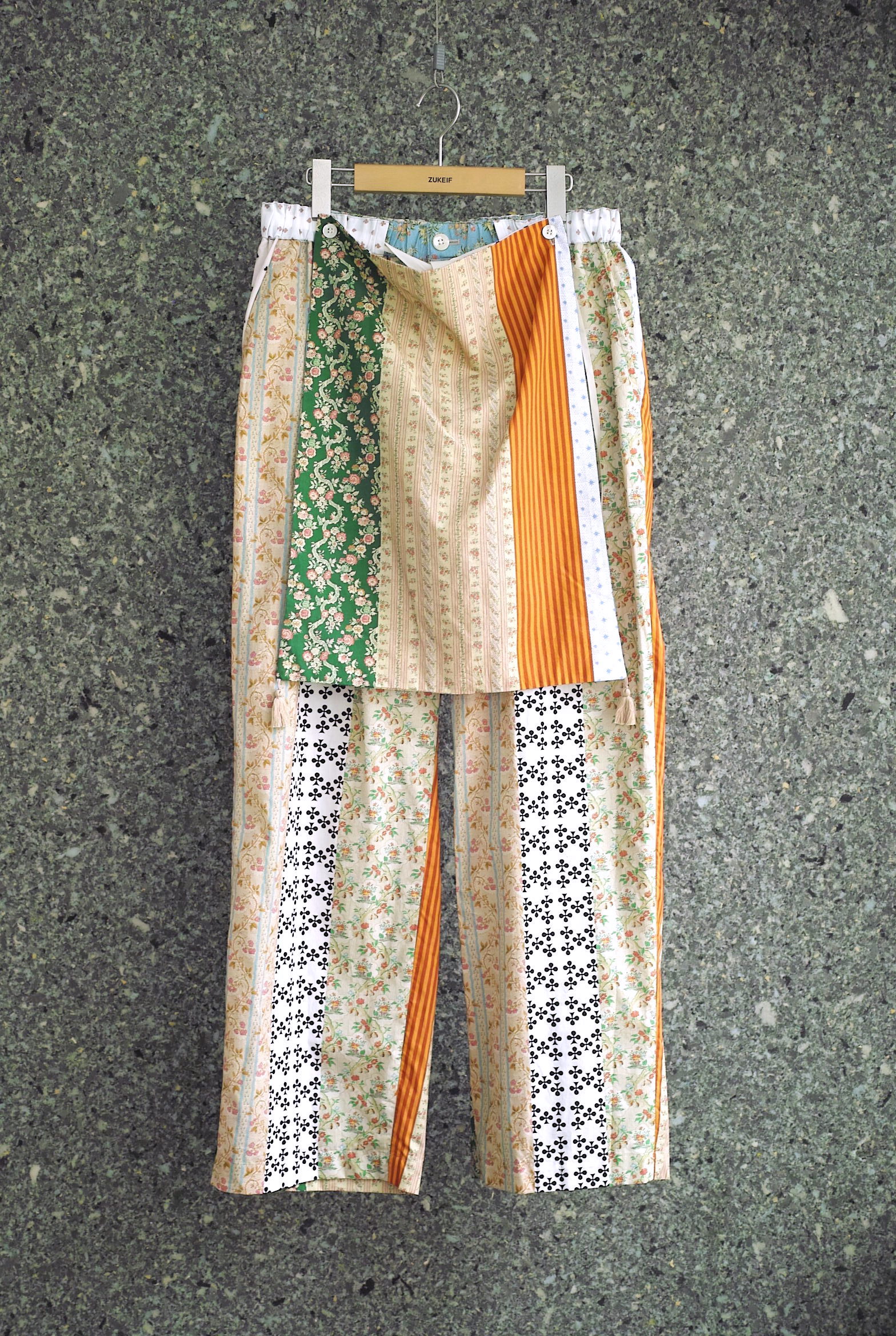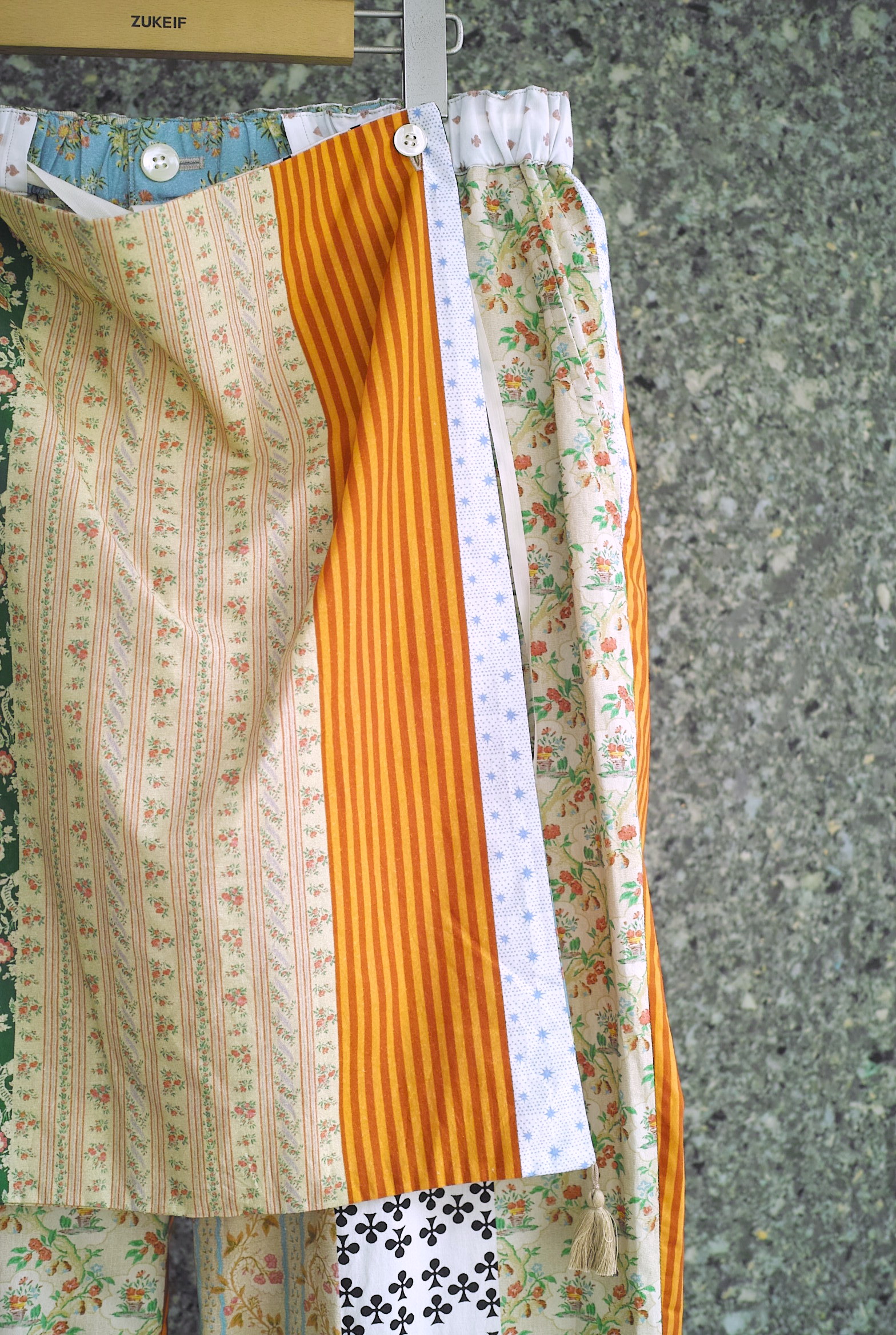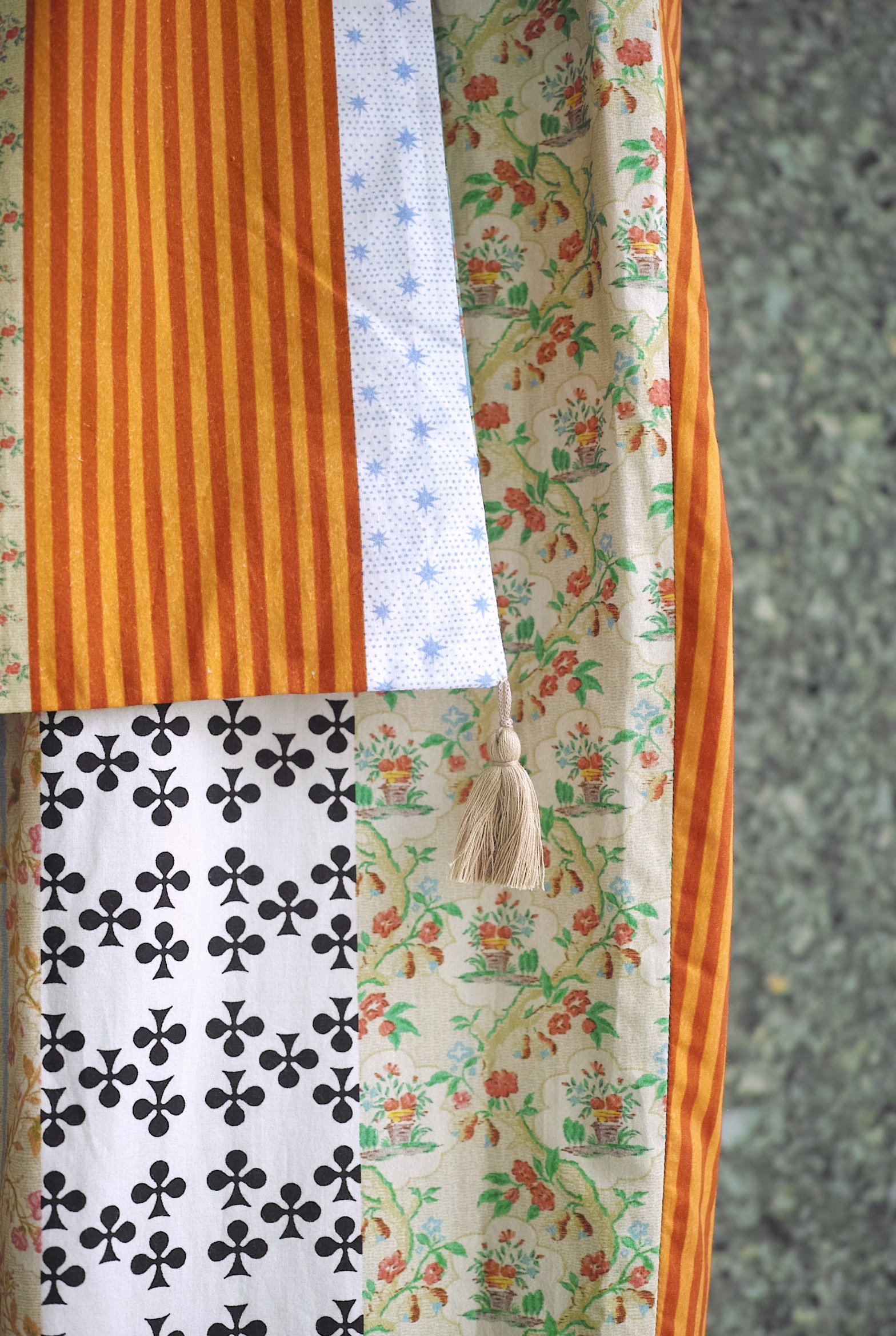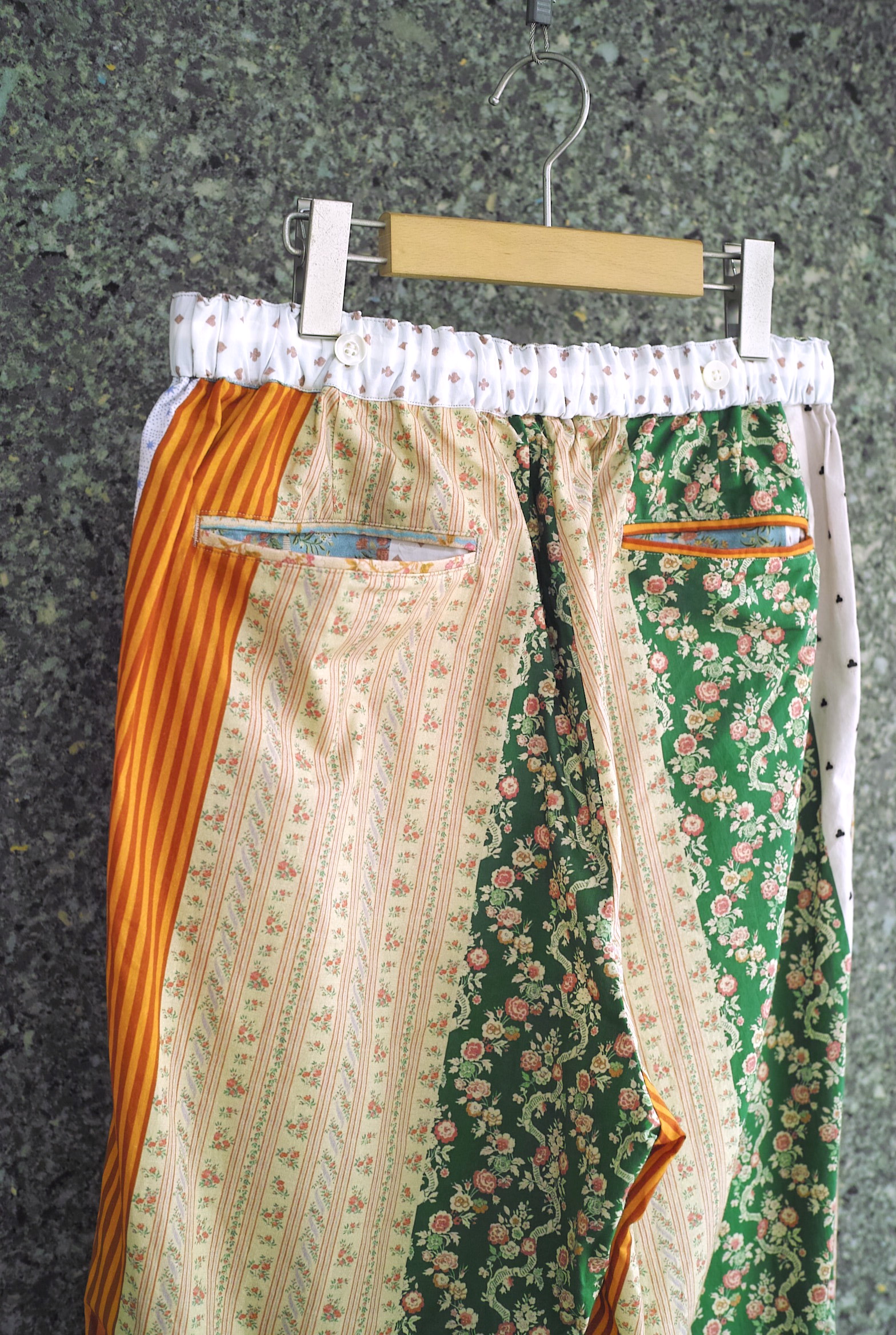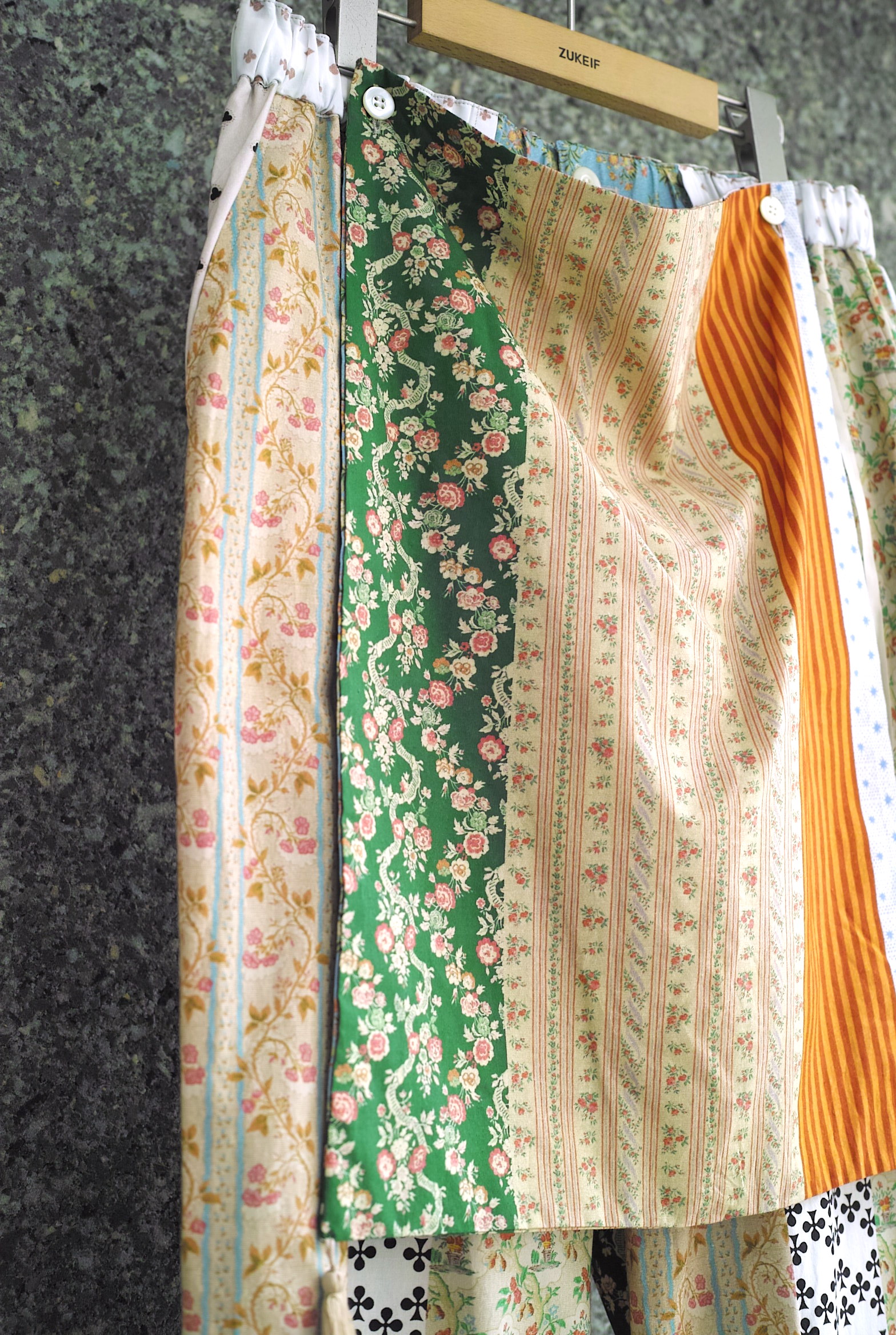 リバティプリントのような花をモチーフとしたクラシックな柄を何種類も縦に切り替えた、今シーズンのMidorikawaオリジナルファブリック。