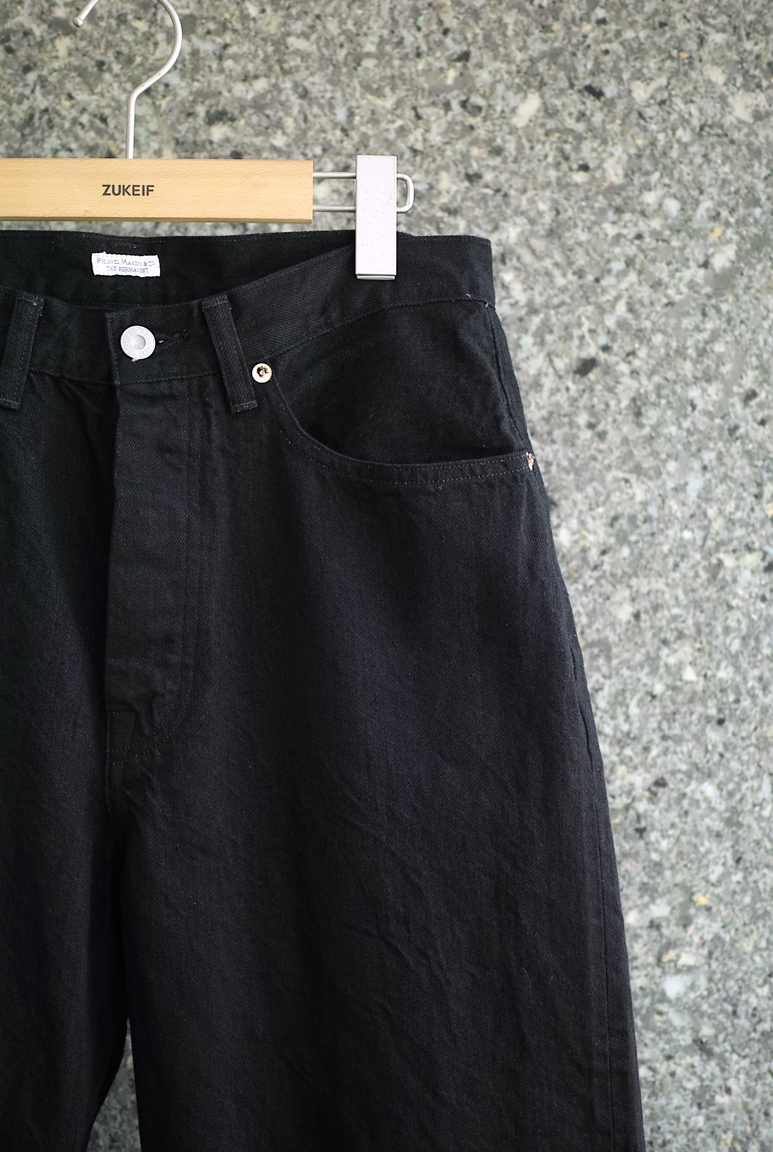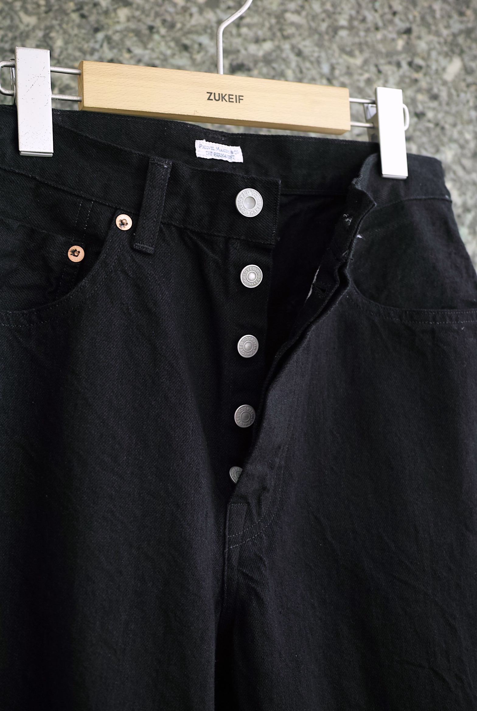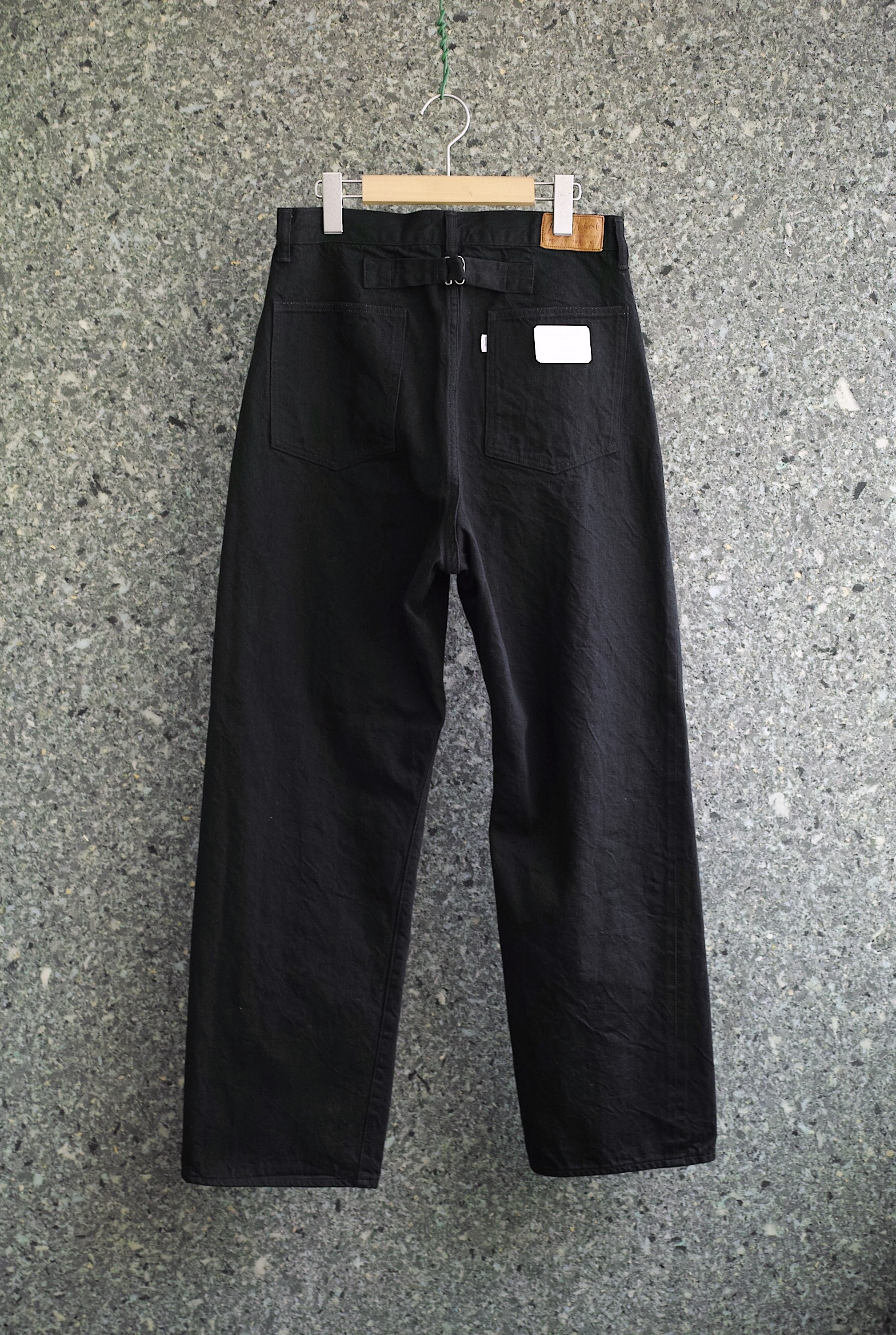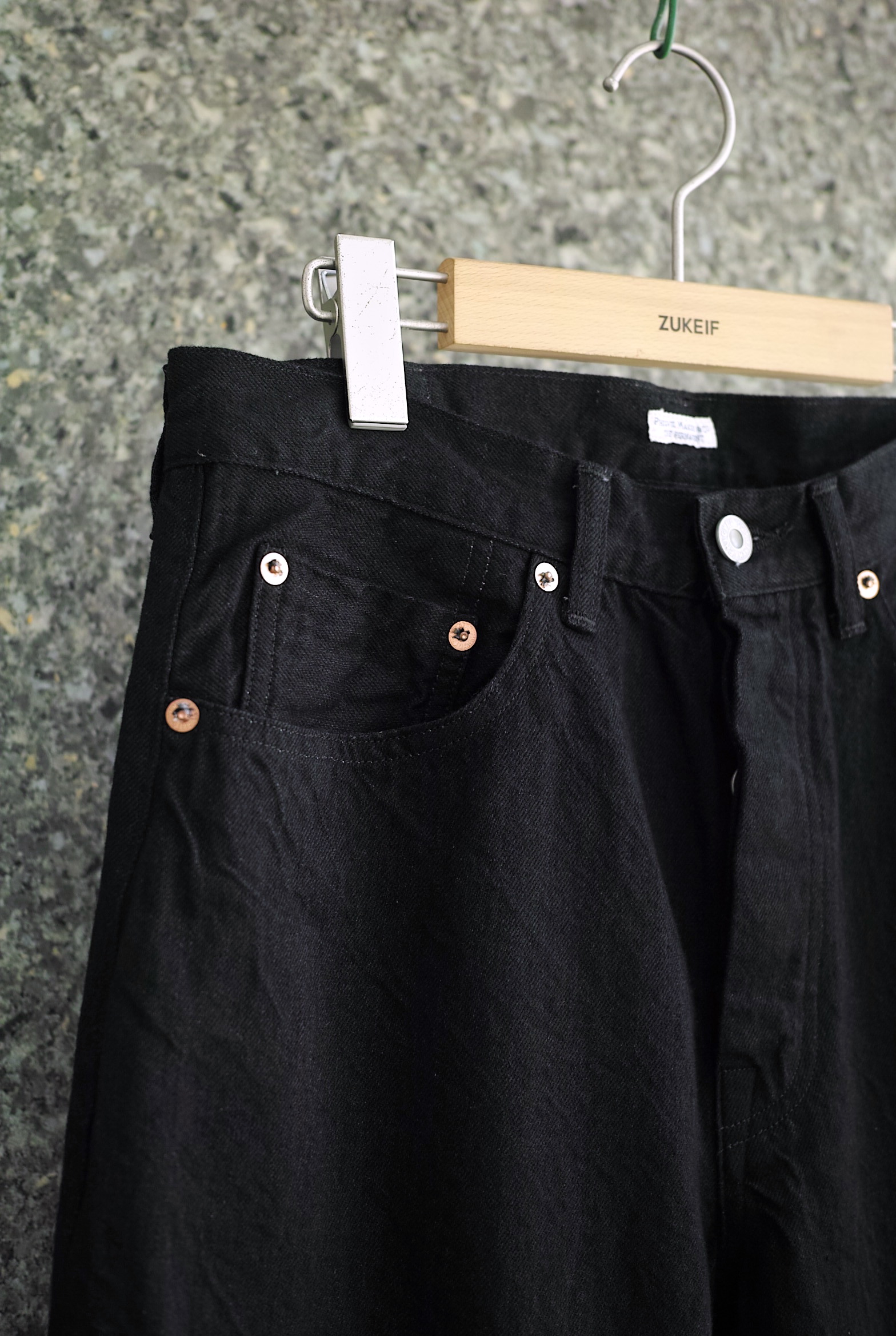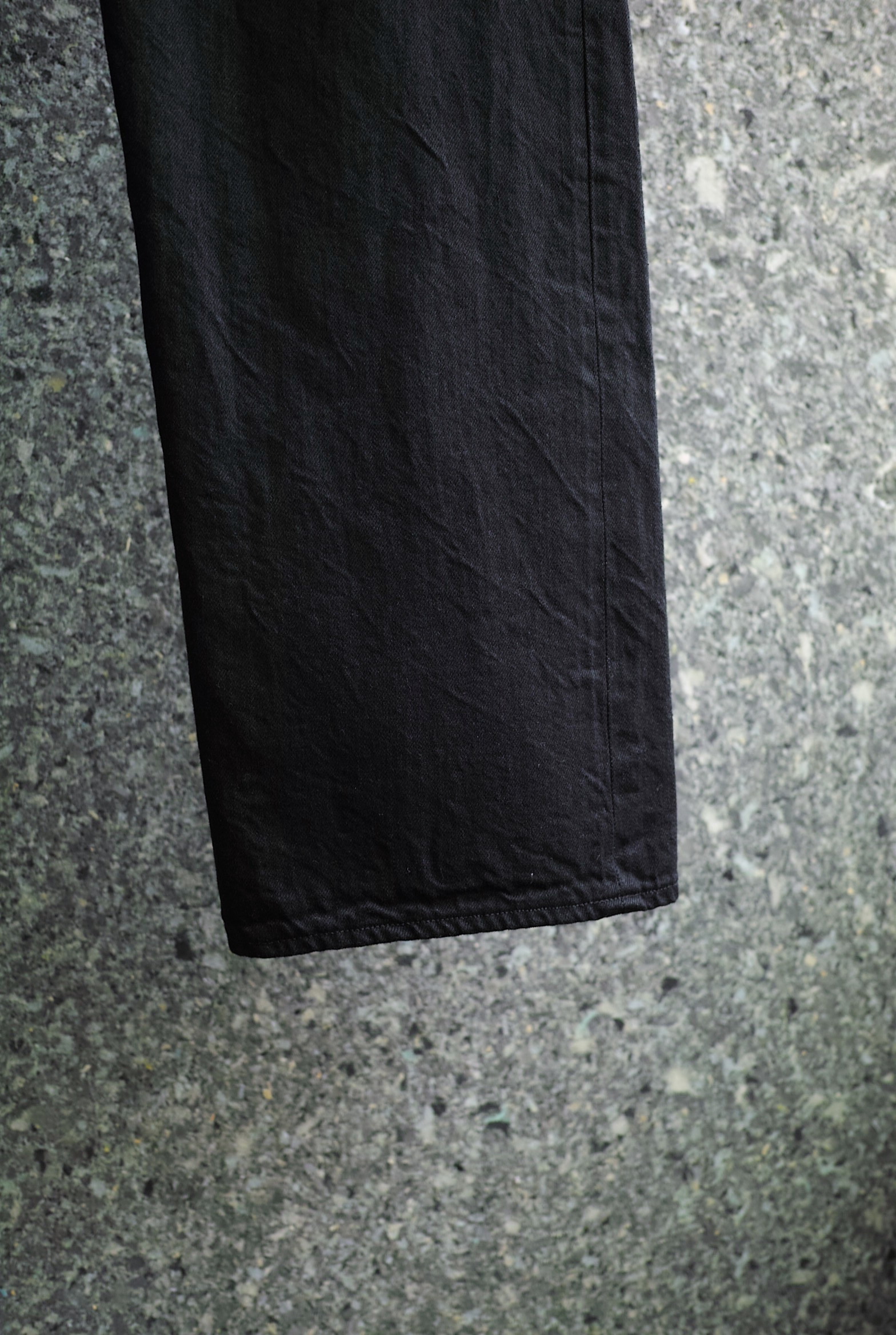 5ポケットのデニムパンツ。すっきり感もあるワイドシルエット。 見た目以上にとても軽い着心地のオリジナル12ozセルビッチデニムを使用。生機(キバタ)仕上げ、1Wash。 毛羽立ちや洗い後の撚れ、凹凸した表情などキバタならではの変化、風合いが現れています。 さらに1Wash後に理想のサイズ感に上がるように設定しています。(丈幅共に1cm程締まる様なイメージ) ~~~~~~~~~~~~~~~~~~~~~~~ BODY:100%COTTON COLOR:BLACK サイズ感のイメージや素材の事など、お気軽に電話/メールにてご相談ください