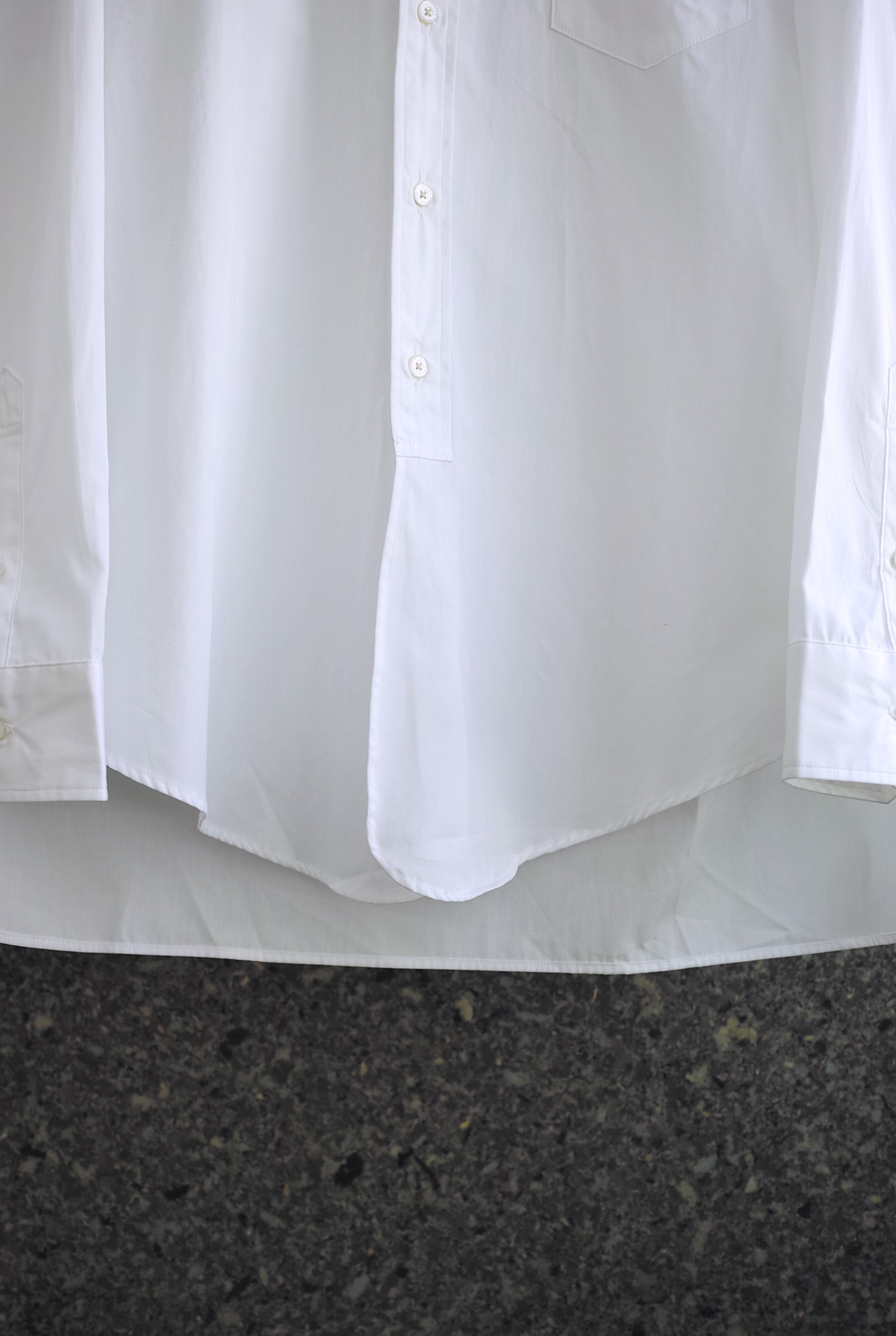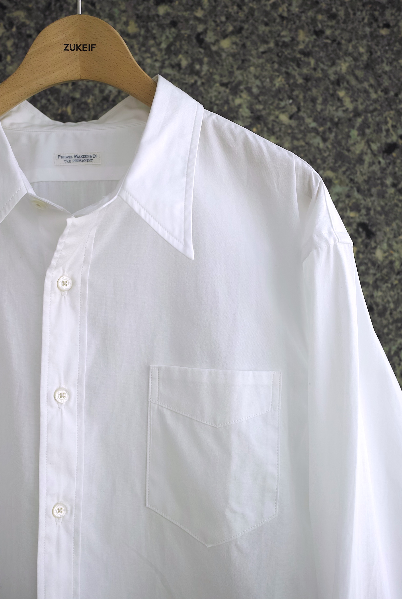 バックヨークのプリーツタックやロングポイントの衿先、裾のカッティングなどクラシックなディテールが特徴の”THE PERMANENT”セミロングドレスシャツ。