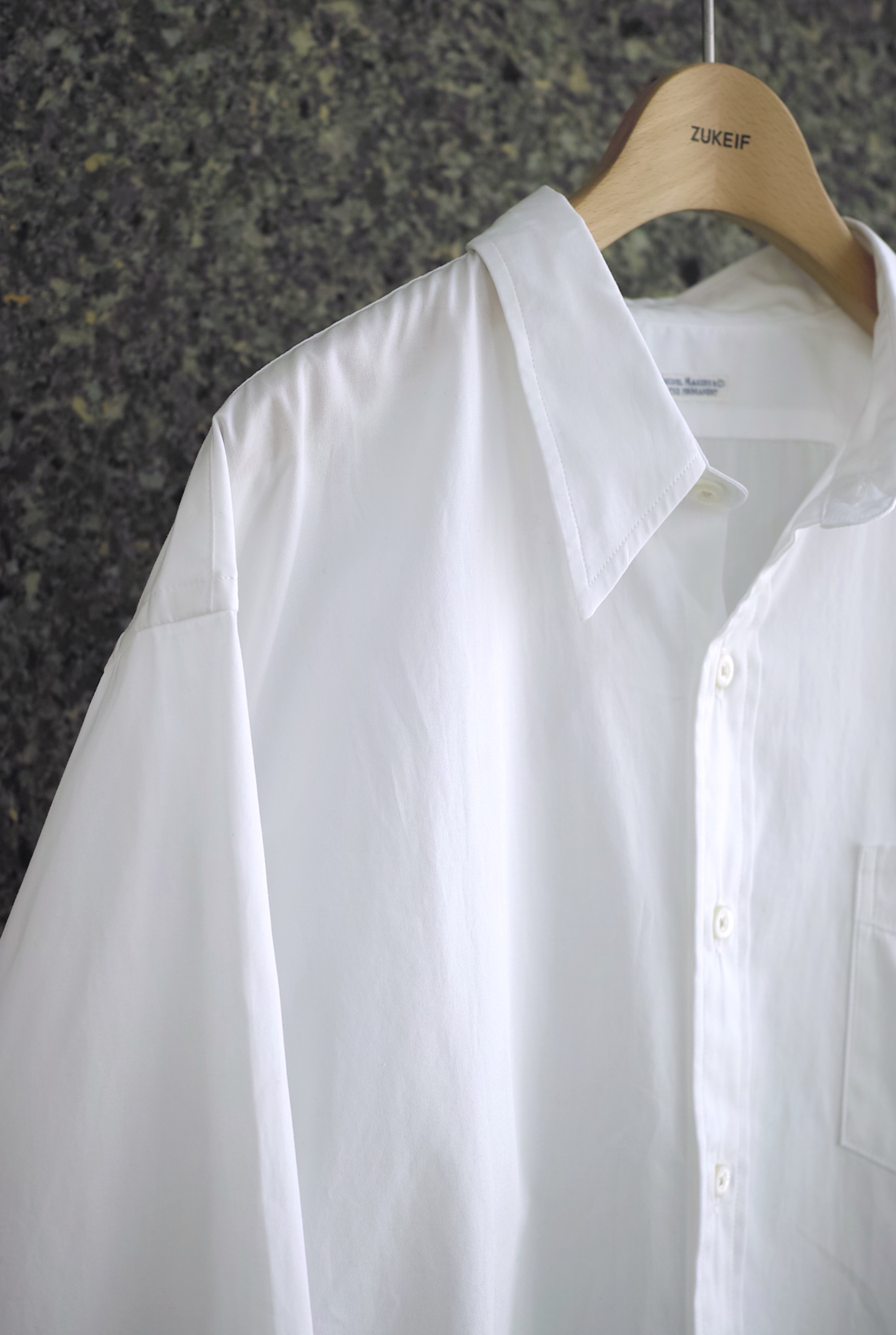上品なドレスシャツと、洗いを掛けた後にでてくるワークシャツの生地のイメージを兼備する精紡交撚糸を使用したポプリン生地。