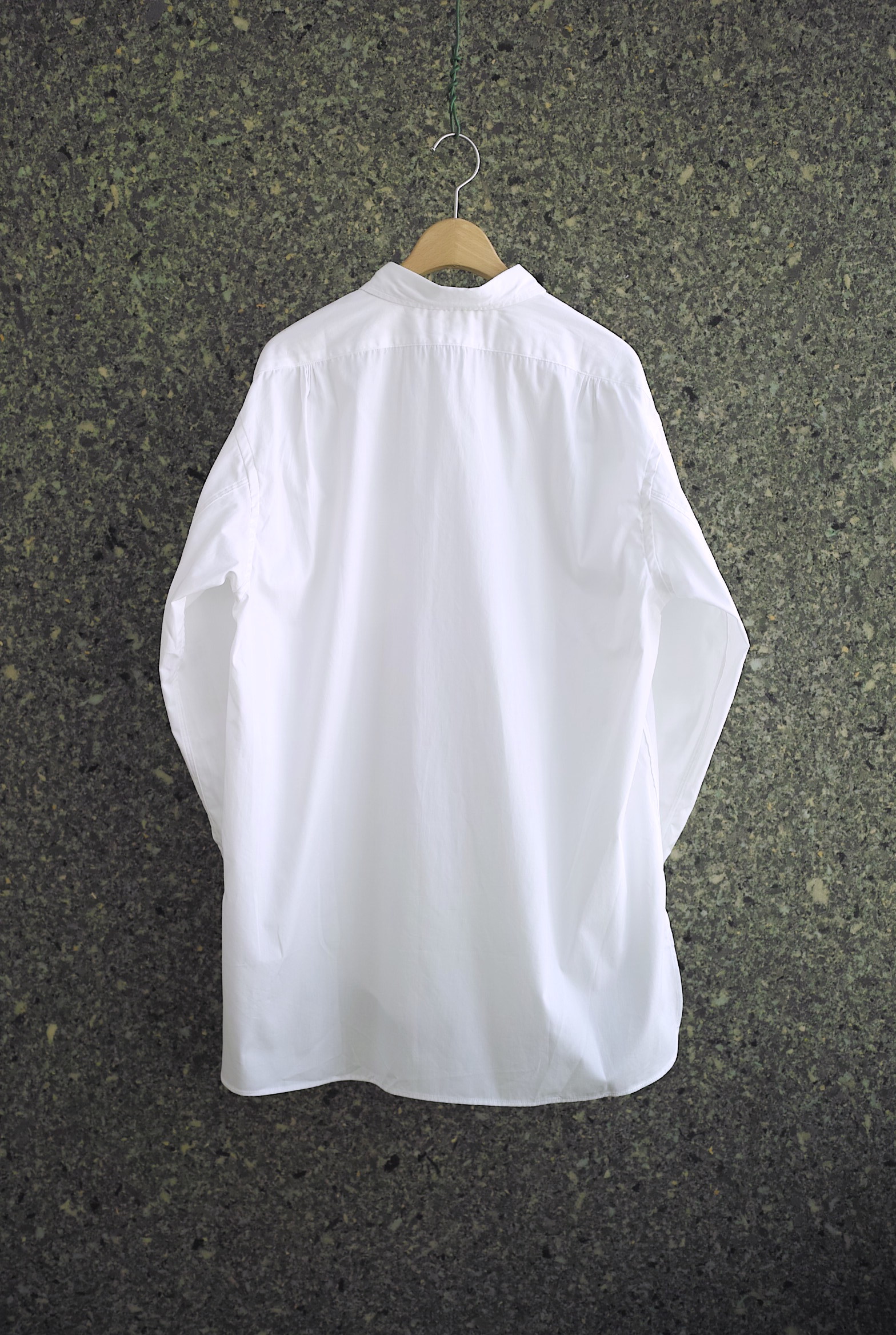 バックヨークのプリーツタックやロングポイントの衿先、裾のカッティングなどクラシックなディテールが特徴の”THE PERMANENT”セミロングドレスシャツ。 こちらも夏のショーツスタイルに合わせるために個人的に楽しみにしていたシャツになります。 上品なドレスシャツと、洗いを掛けた後にでてくるワークシャツの生地のイメージを兼備する精紡交撚糸を使用したポプリン生地。 ※洗濯後、着丈と袖丈に約1.5cm/肩幅と身幅に約0.5cmの縮みが生じます。 ~~~~~~~~~~~~~~~~~~~~~~~ BODY:100% COTTON COLOR:OFF WHITE サイズ感のイメージや素材の事など、お気軽に電話/メールにてご質問ください。
