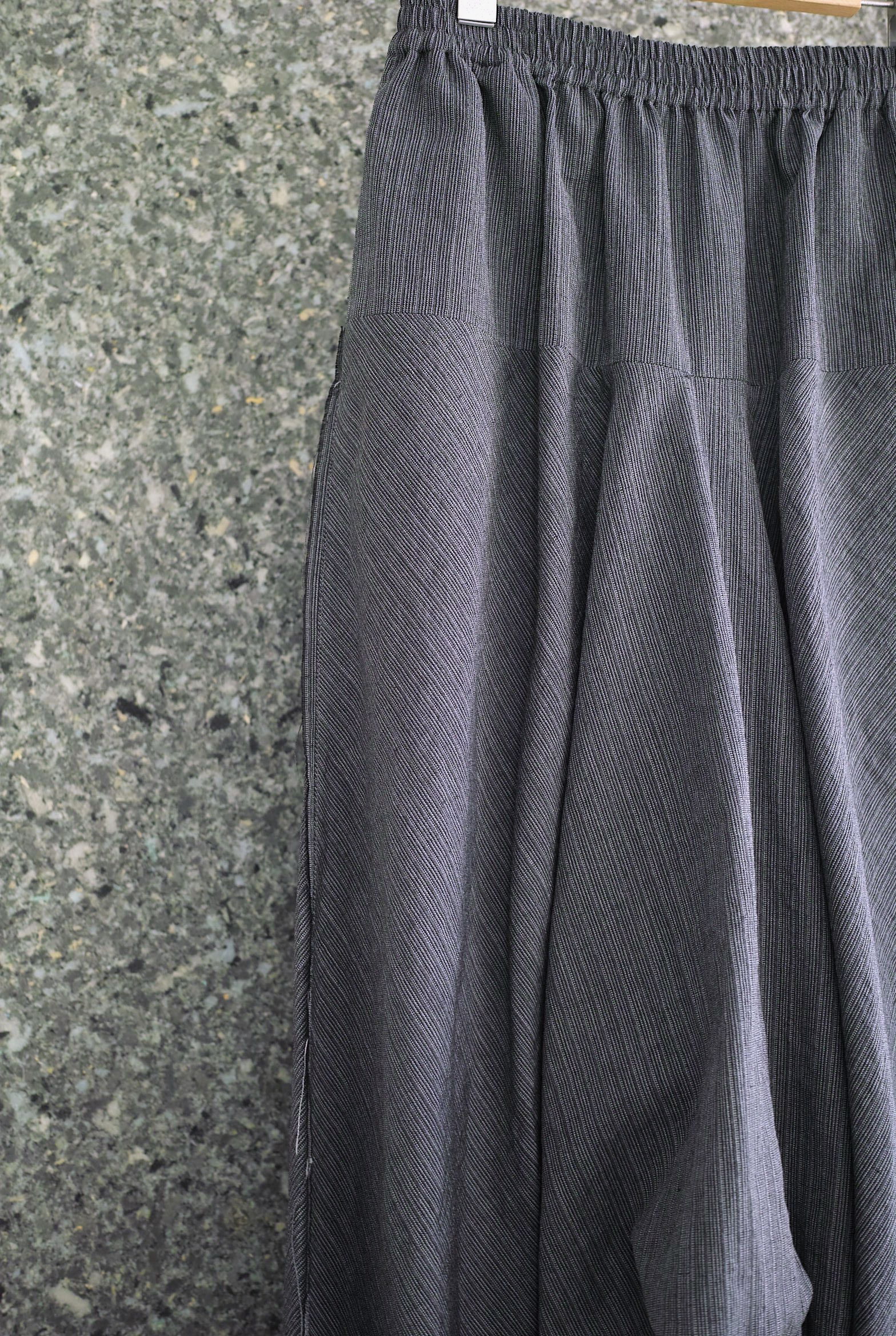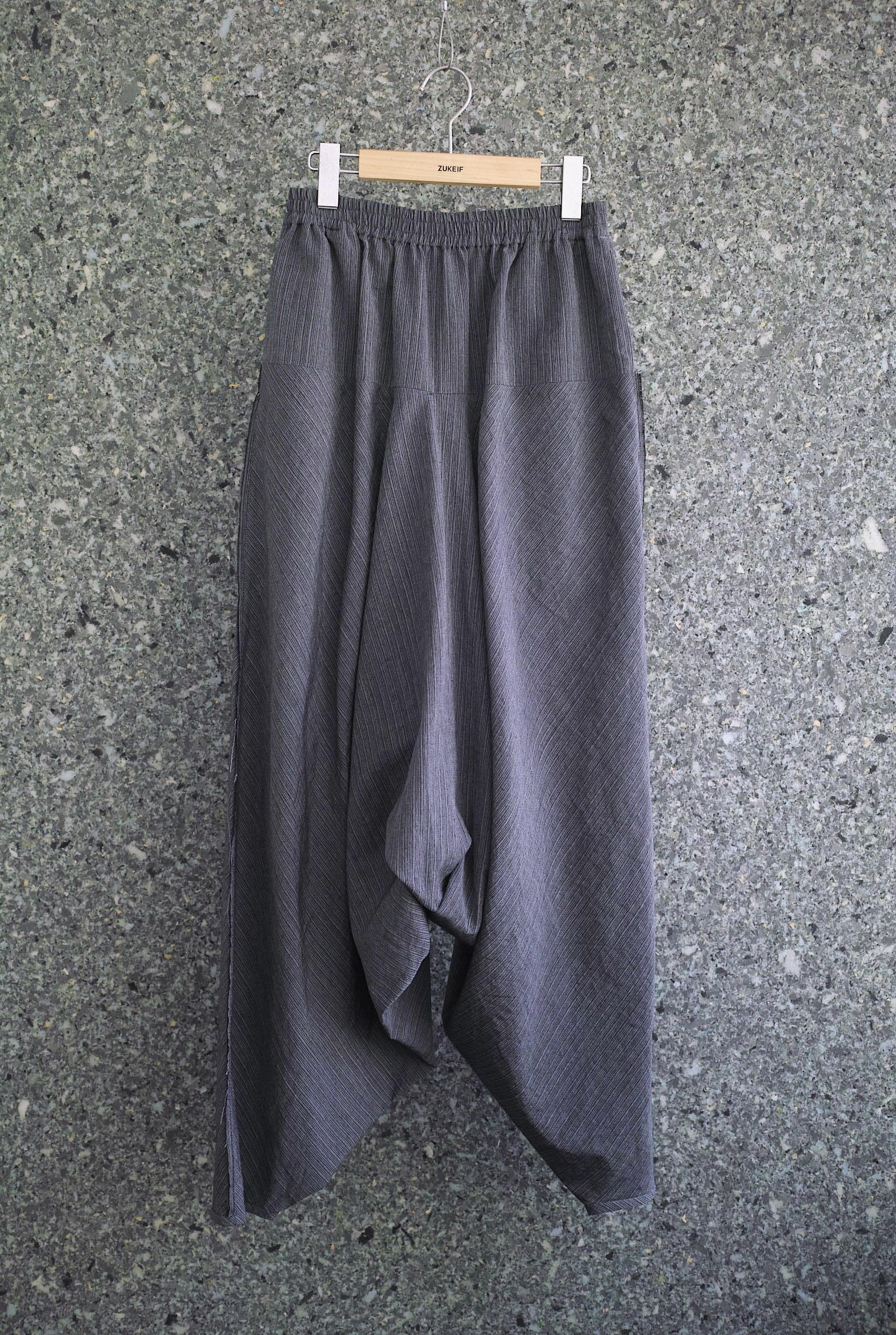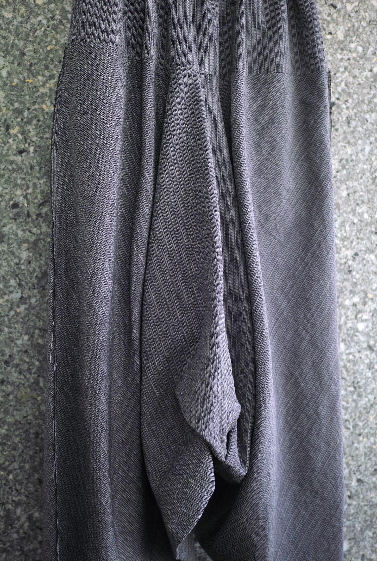 足首にまで届きそうな深い股に、大胆なボリューム/分量を組み合わせた立体的なシルエット。とっても動き易く穿きやすいです。 イタリア”LYRIA社”のウール/ラミーストライプ、独特なシャリ感とドレープの美しい生地。 ~~~~~~~~~~~~~~~~~~~~~~~ BODY:67%WOOL 67%RAMIE COLOR:GREY サイズ感のイメージや素材の事など、お気軽に電話/メールにてご相談ください。