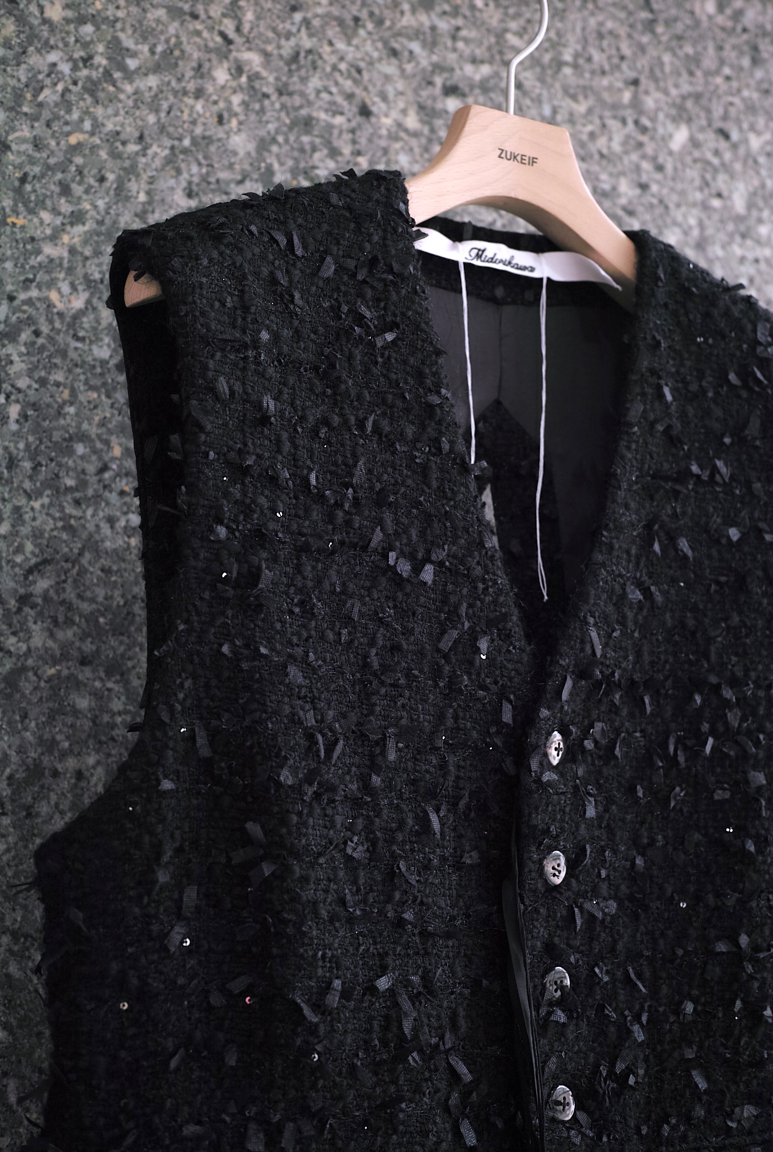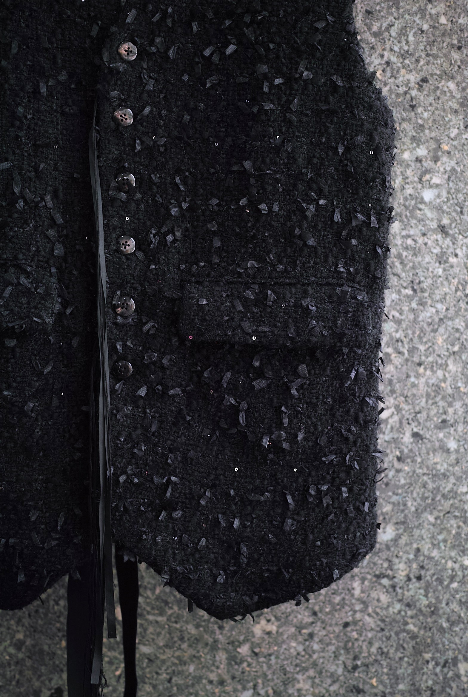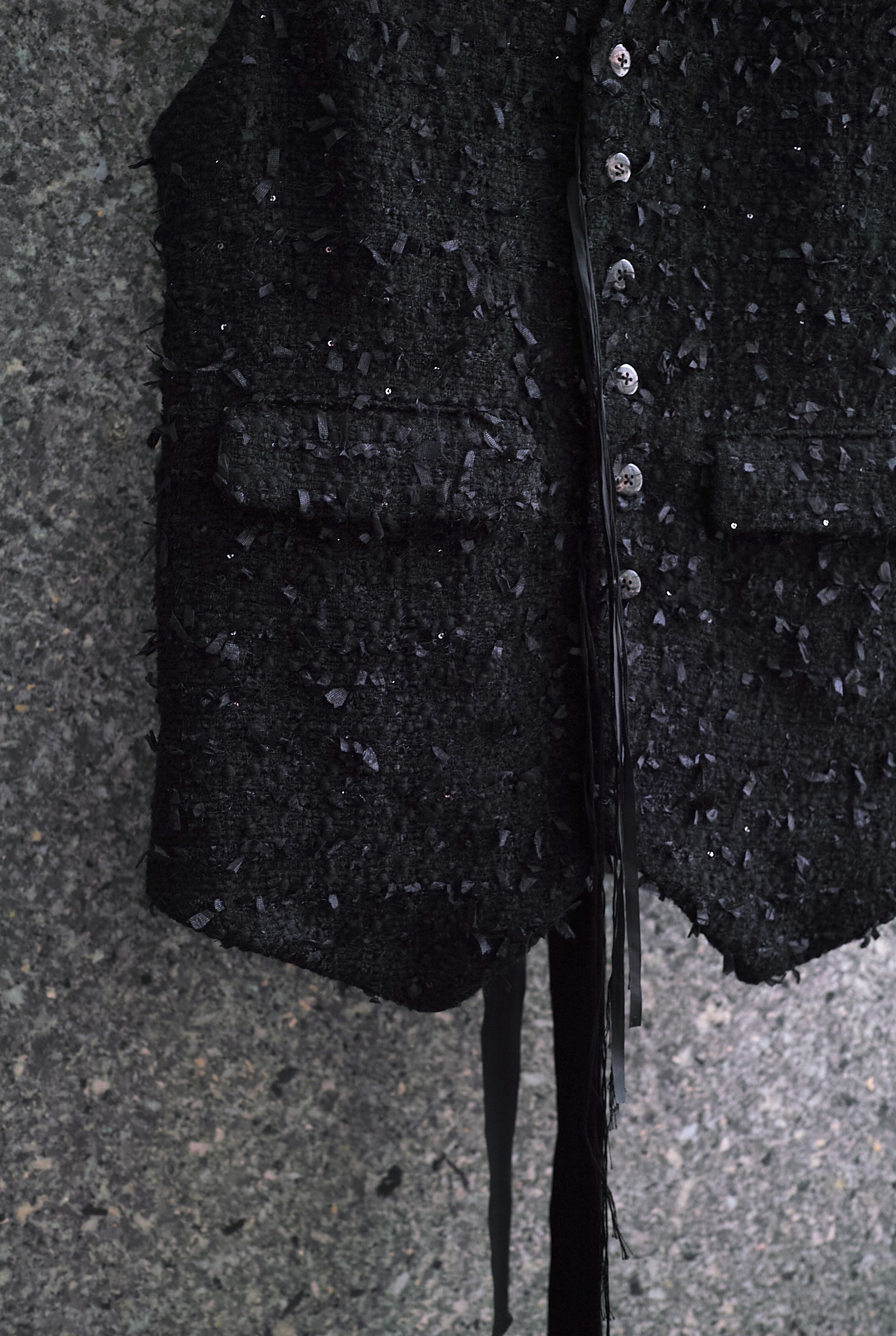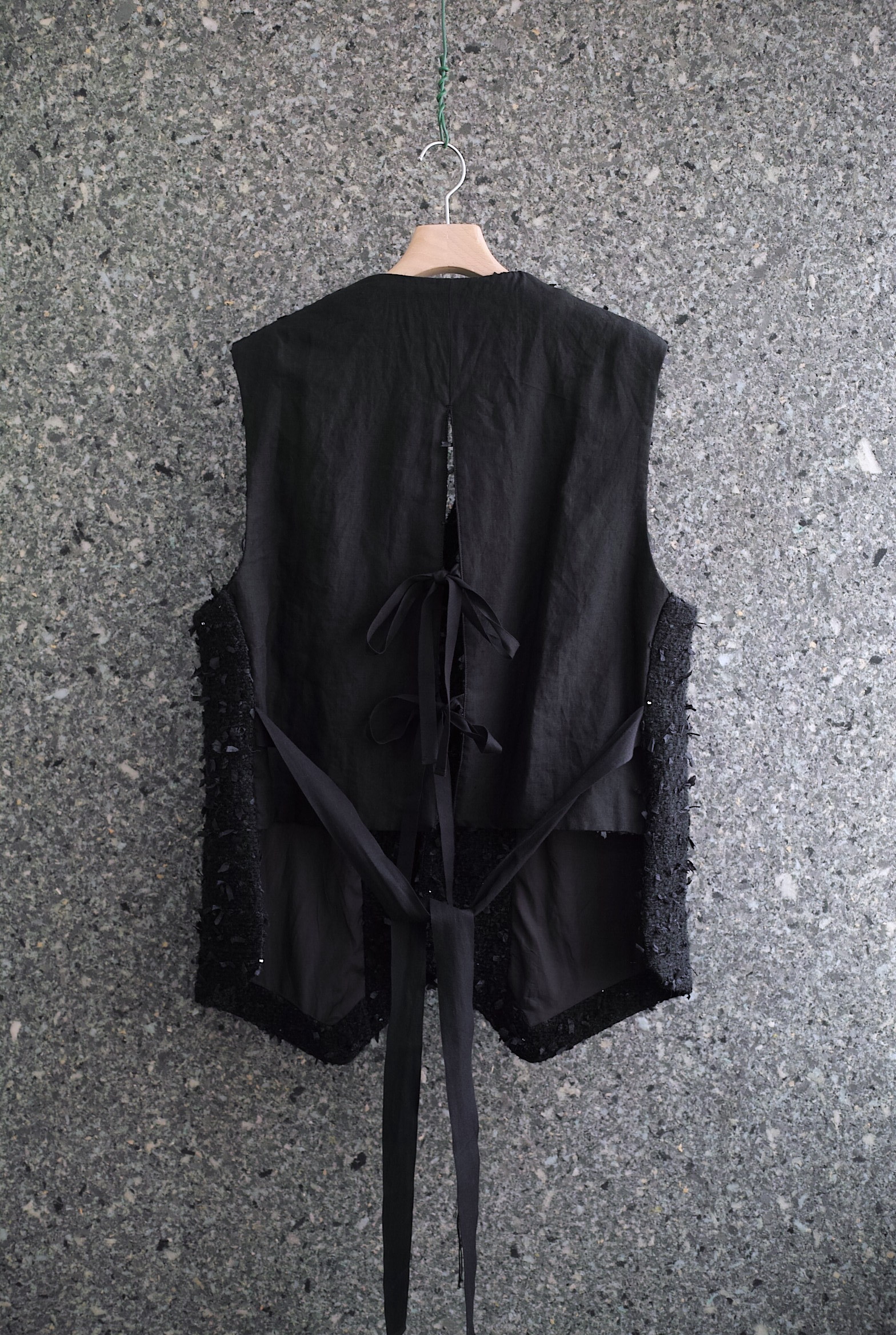 前身頃が大きく、後ろの着丈が短いベスト。 ワークやハンティングのようなボリュームのある前身に対して背面はジレのようなすっきりと綺麗な印象です。 8種類の表情豊かな糸で織られたMidorikawaオリジナルのファンシーツイード生地。 ~~~~~~~~~~~~~~~~~~~~~~~ BODY:66% WOOL/22% NYLON/8% POLYESTER/3% RAYON/1% ACRYLIC BACK:100% LINEN LINING:54% RAYON/46% COTOON COLOR:BLACK サイズ感のイメージや素材の事など、お気軽に電話/メールにてご相談ください。