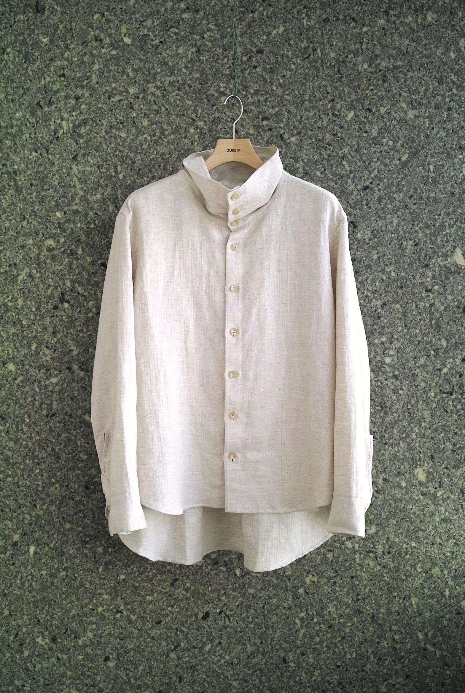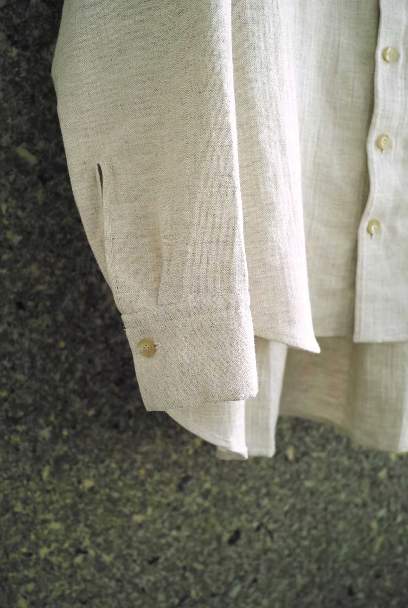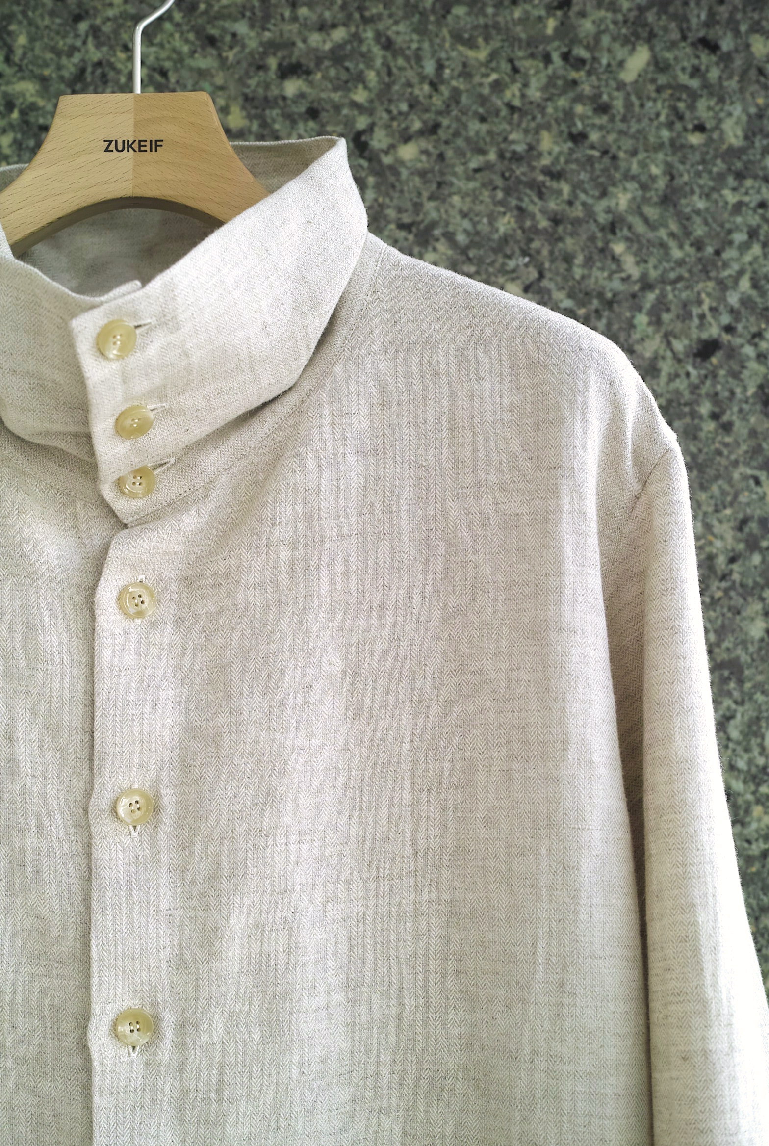 コートのような襟型のハイネックシャツ。立たせても、開いて寝かせても収まりの良い襟です。 ふっくらと柔らかな表情の[コットン/リネン]ヘリンボン織りの生地。 軽いアウターのようにシャツの上からバサッと羽織るのもいいですし、暑い日にはタンクトップに合わせても心地良く着用していただけます。 ~~~~~~~~~~~~~~~~~~~~~~ BODY:44% COTTON/28% LINEN/28% RAMIE COLOR:NATURAL サイズ感のイメージや素材の事など、お気軽に電話/メールにてご質問ください。