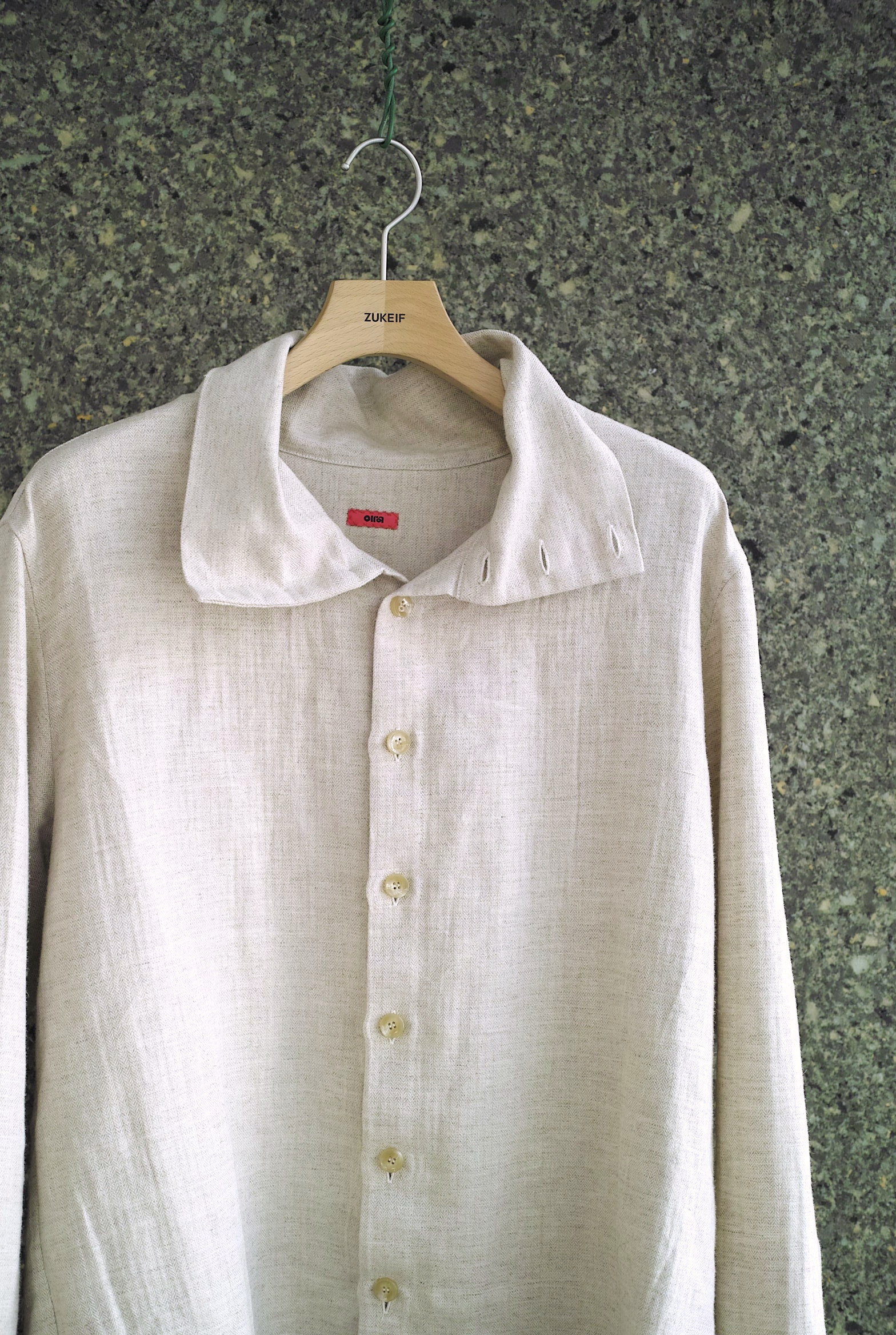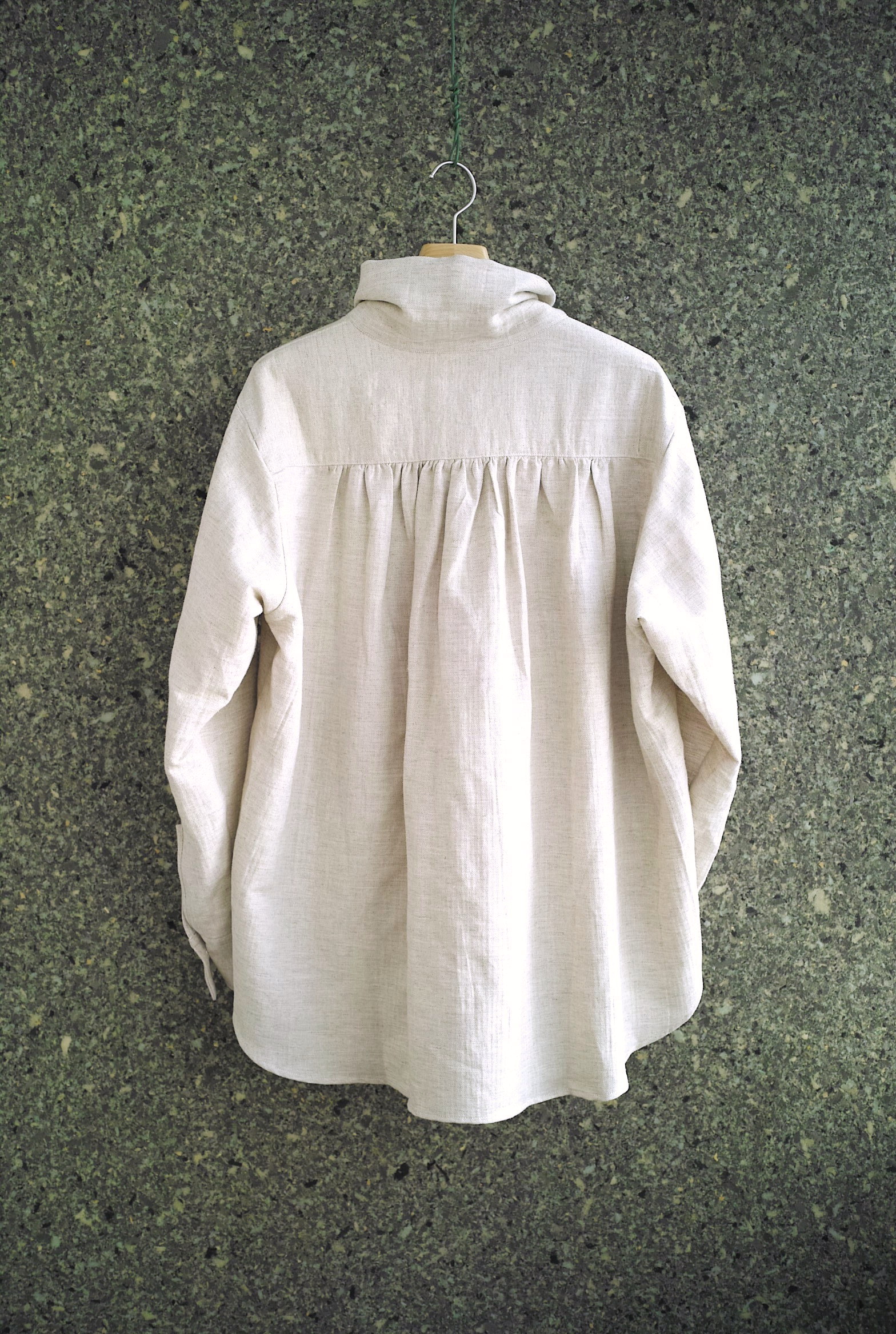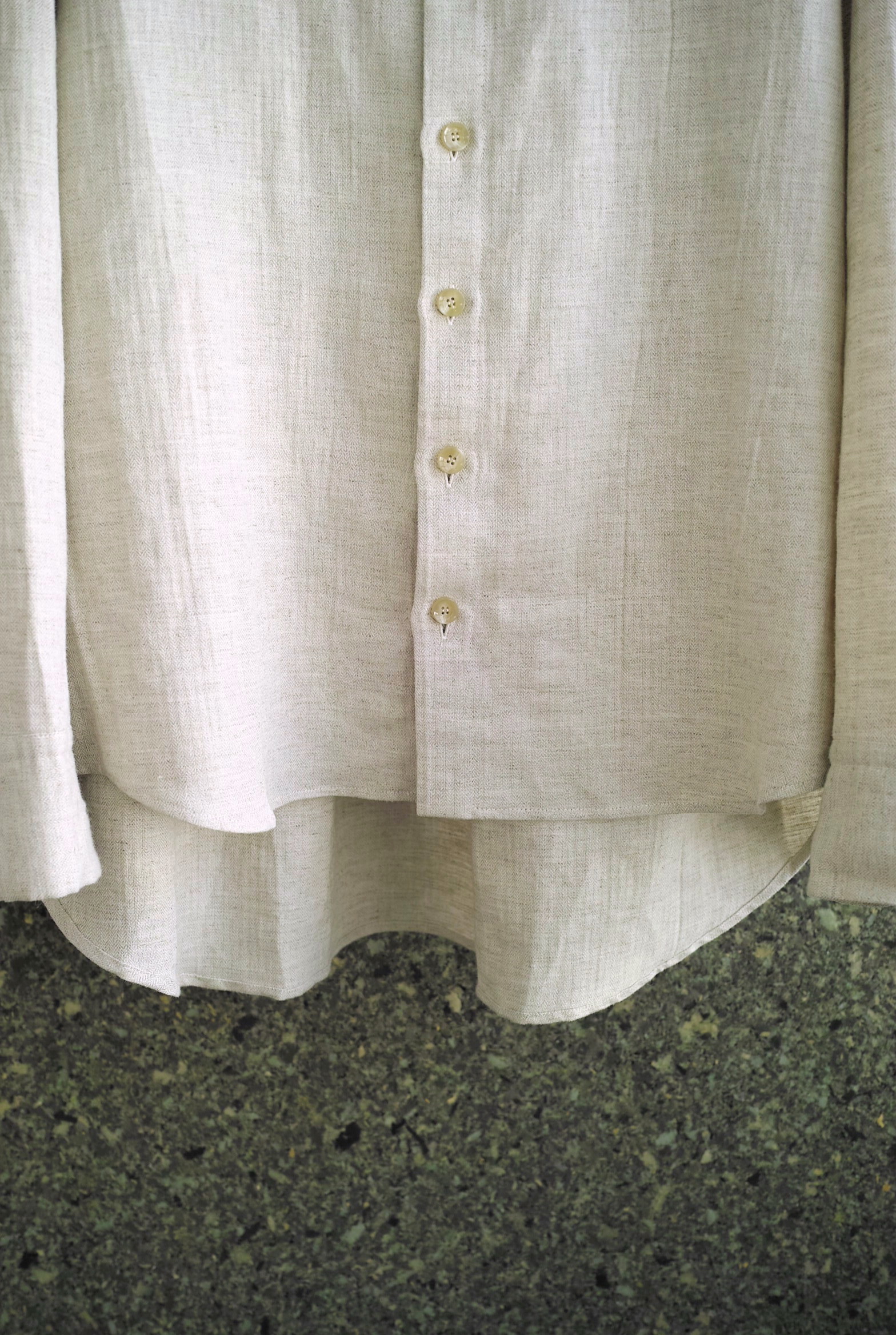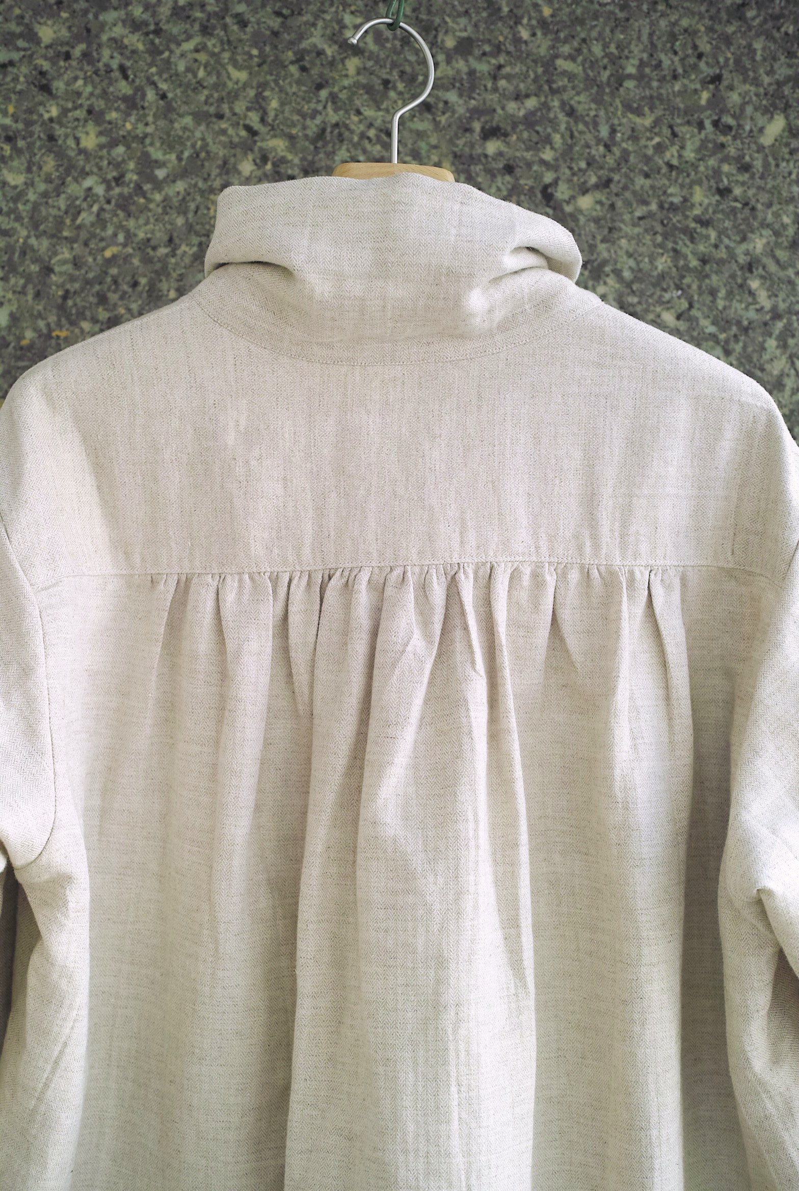 コートのような襟型のハイネックシャツ。立たせても、開いて寝かせても収まりの良い襟です。 ふっくらと柔らかな表情の[コットン/リネン]ヘリンボン織りの生地。 軽いアウターのようにシャツの上からバサッと羽織るのもいいですし、暑い日にはタンクトップに合わせても心地良く着用していただけます。 ~~~~~~~~~~~~~~~~~~~~~~ BODY:44% COTTON/28% LINEN/28% RAMIE COLOR:NATURAL サイズ感のイメージや素材の事など、お気軽に電話/メールにてご質問ください。