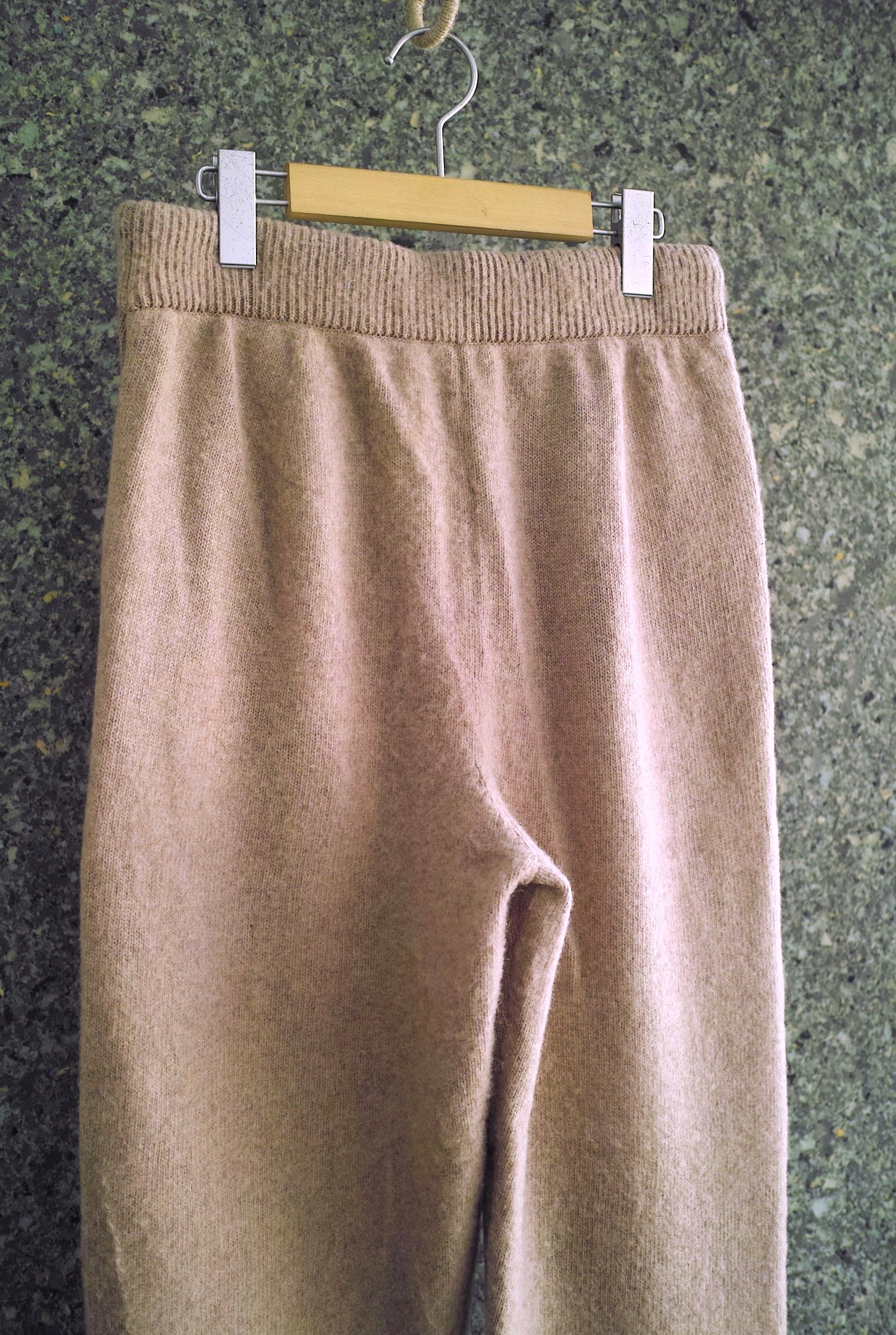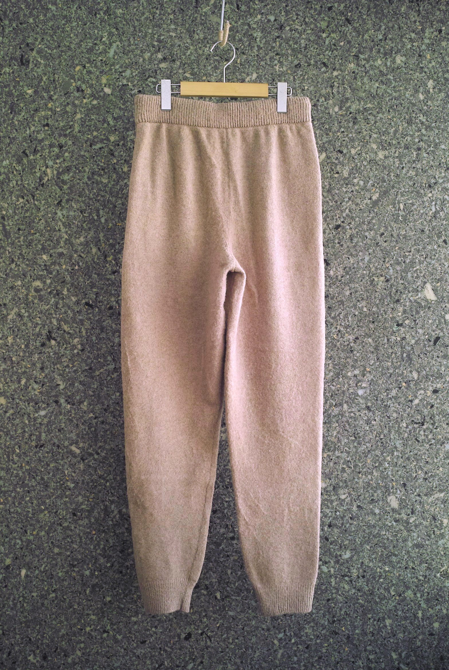 カシミヤ/ウールを使用したニットパンツ。軽量で保温性が高く肌触りの良いタッチが特徴。 形はすっきりとしたリブパンツですが、裾丈が靴に溜まるような設定になるのでスウェットやナイロンでは引き出せない、上品なリラックスパンツのイメージです。 穿いていく事でニット特有の毛羽立ちや、ゆるいフィット感/シルエットが徐々に現れてきます。おすすめ。 ~~~~~~~~~~~~~~~~~~~~~~~ BODY:50%CASHMERE 50%WOOL COLOR:C.BEIGE サイズ感のイメージや素材の事など、お気軽に電話/メールにてご相談ください