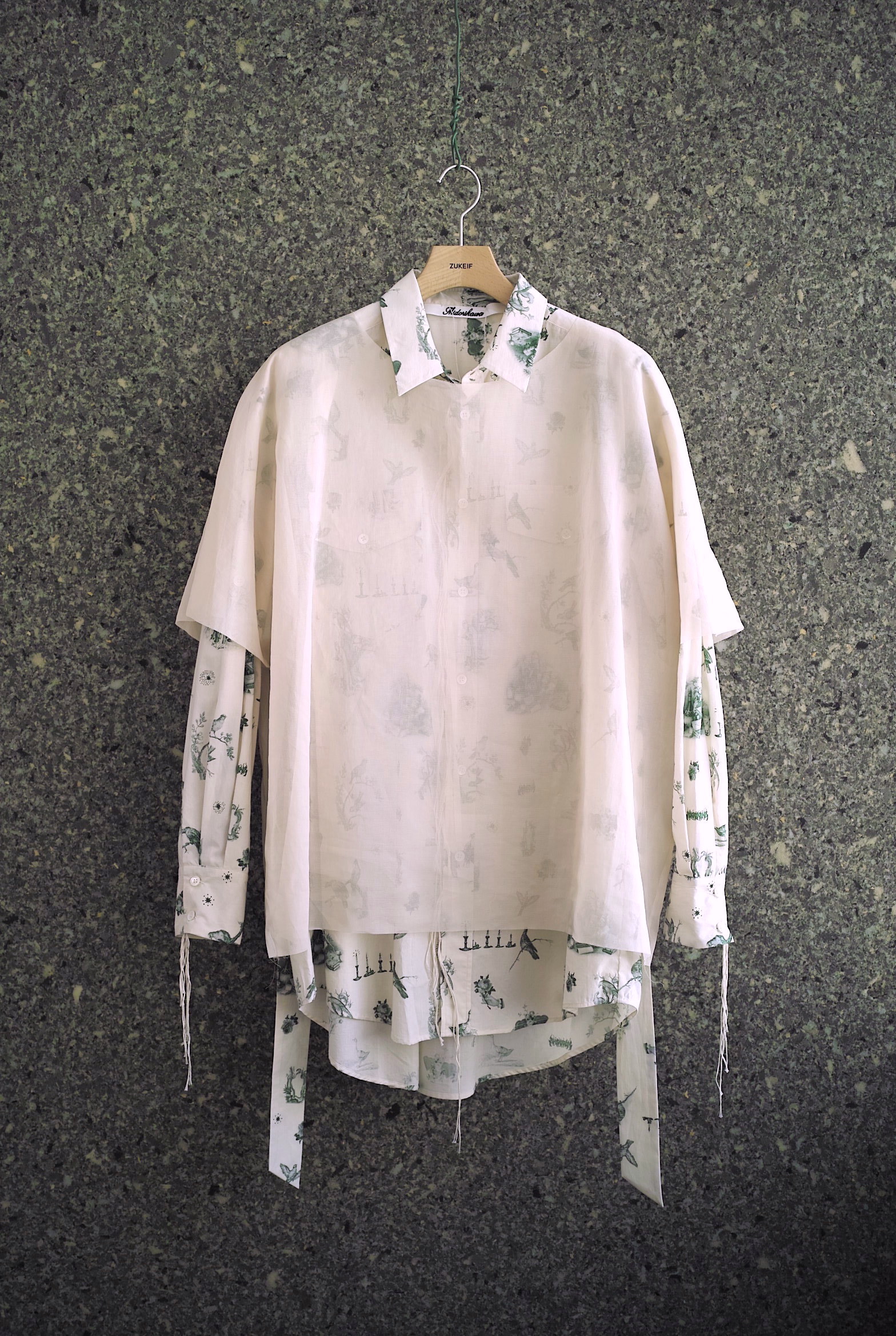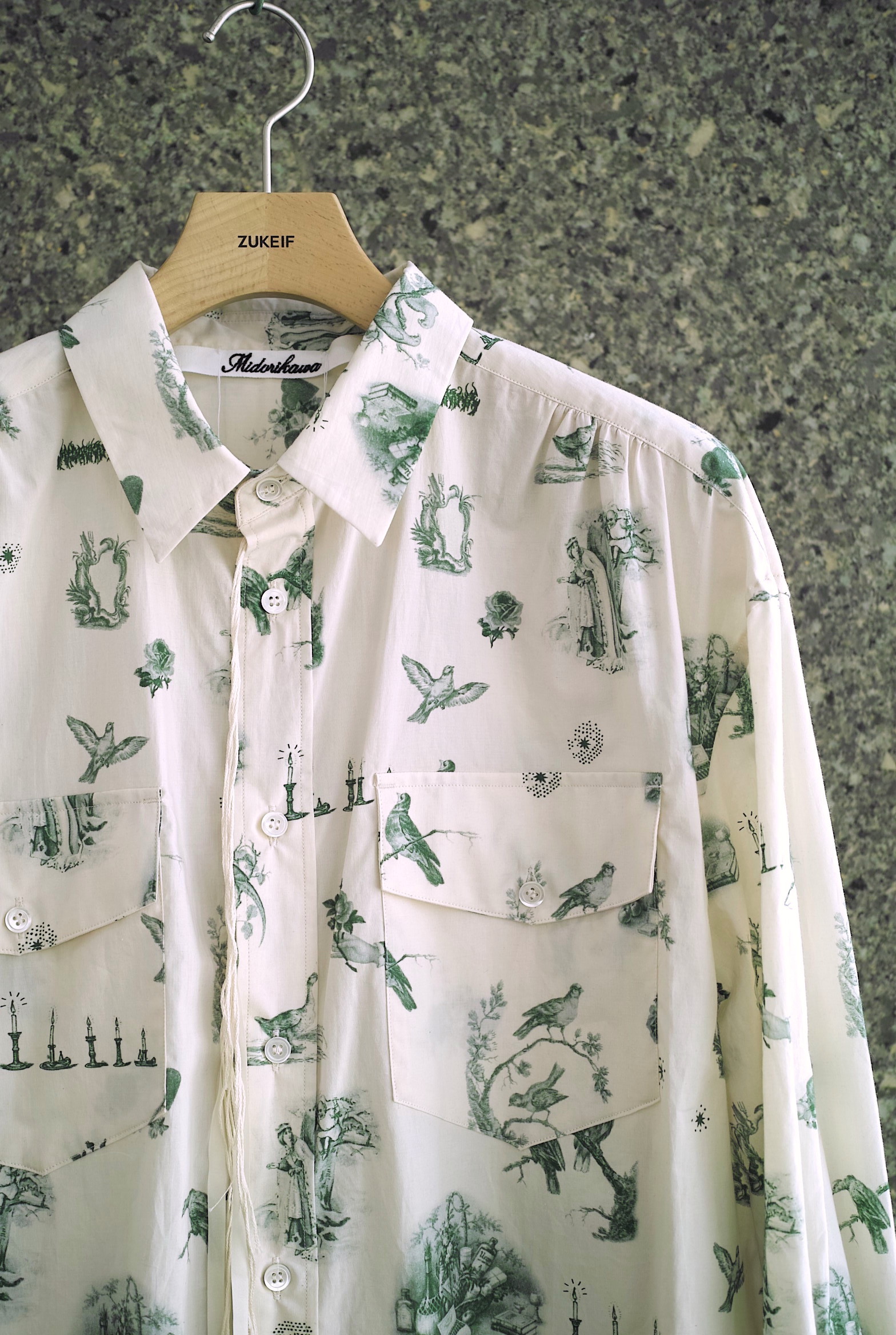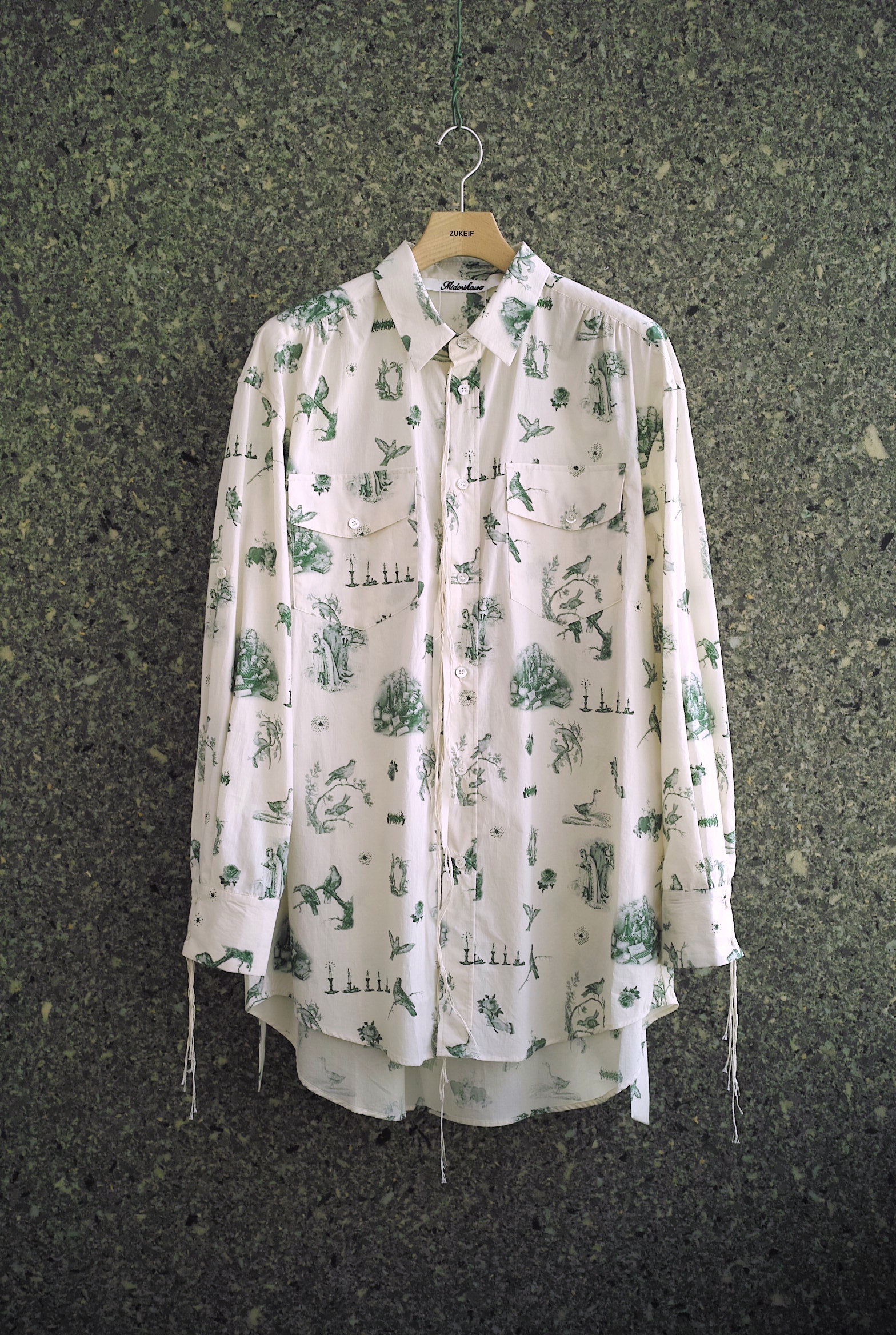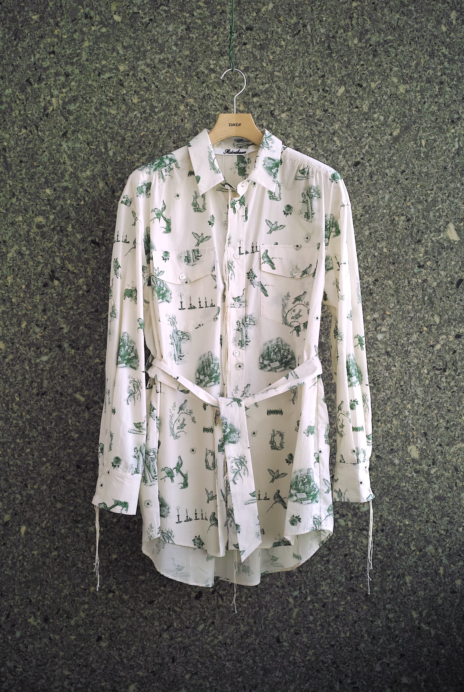 超長綿のMidorikawaオリジナルシーツクロスで仕立てたワークシャツ。 今シーズンはアイボリーボディに色々な鳥や蝋燭がプリントされた柄”CANDLE”。 ハーフコートのような緩いシルエット、共地のベルト付き。 シャツの上からレイヤードするオーガンジーのプルオーバーもセットになります。 ~~~~~~~~~~~~~~~~~~~~~~~ BODY:100% COTTON ORGANDY:100% COTTON COLOR:CANDLE サイズ感のイメージや素材の事など、お気軽に電話/メールにてご質問ください。