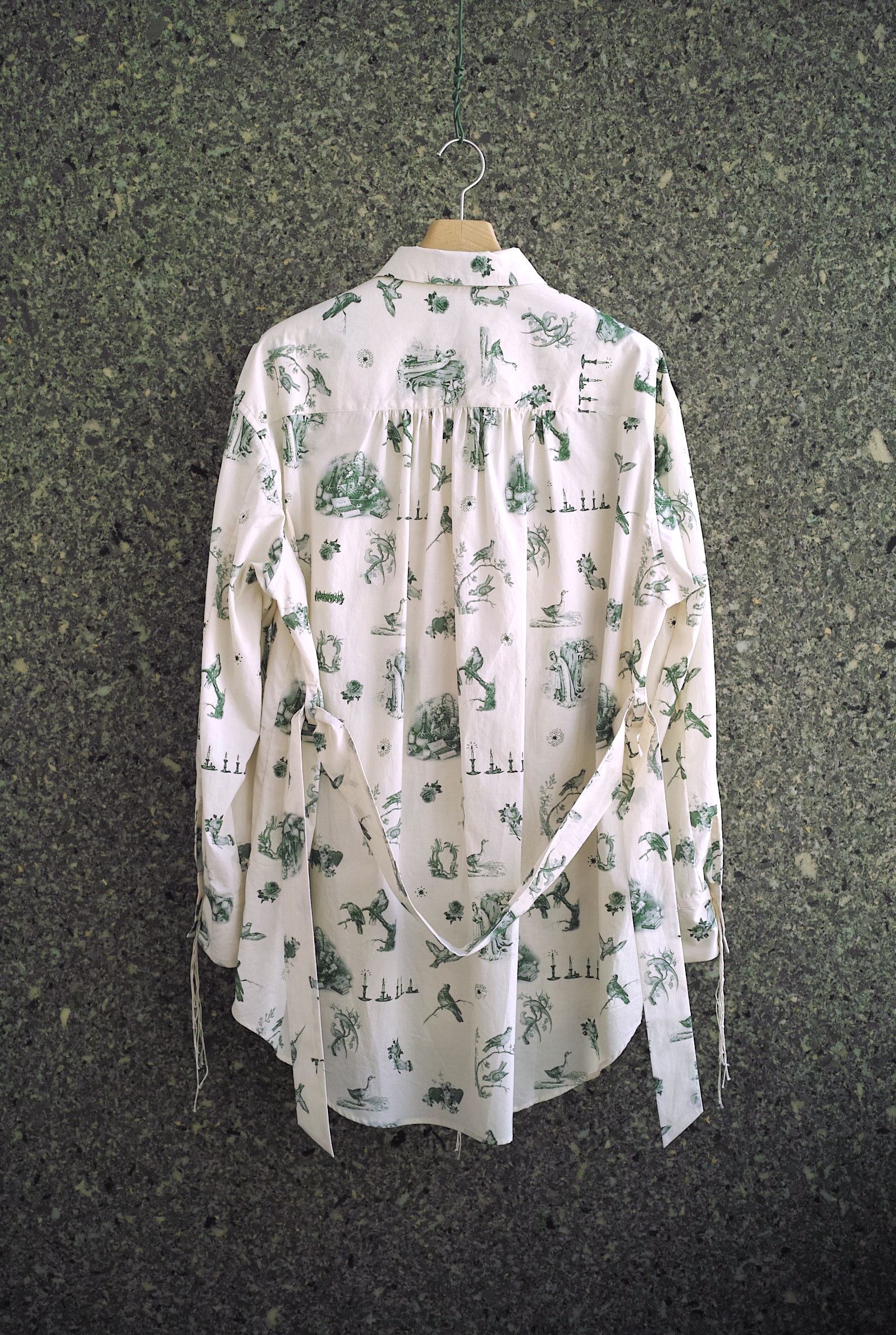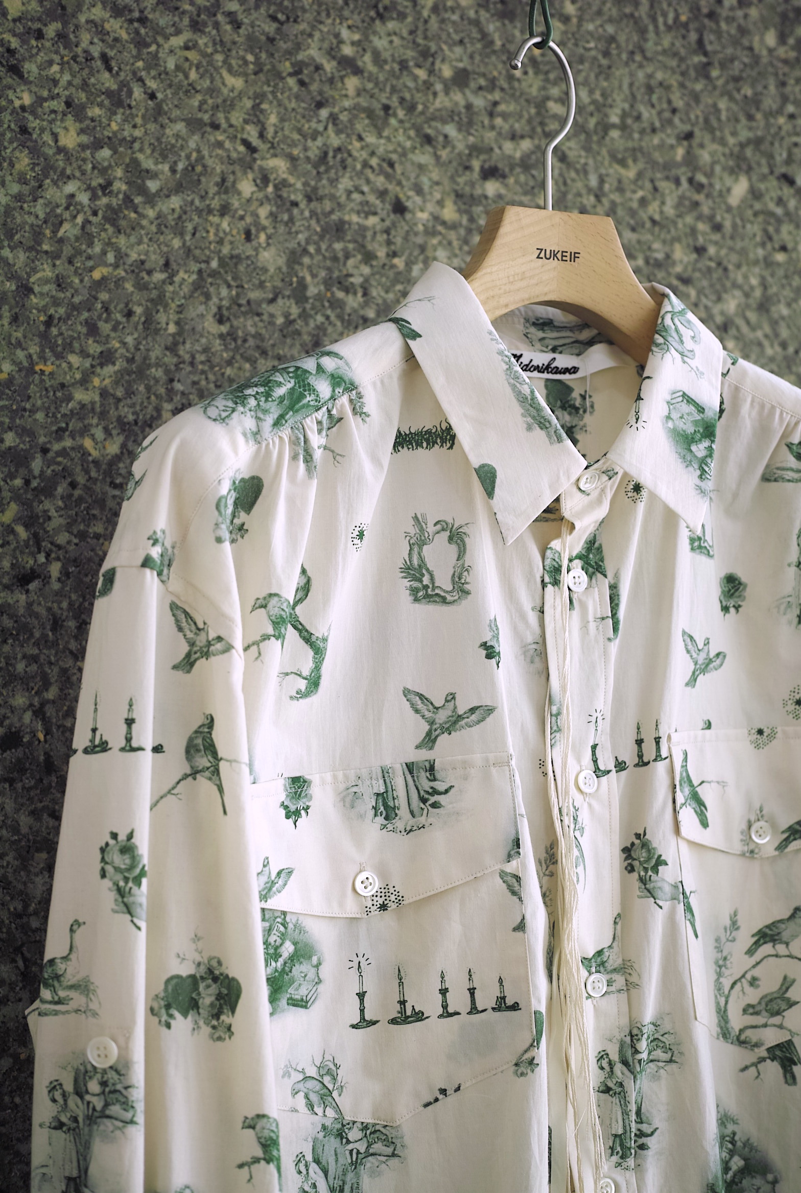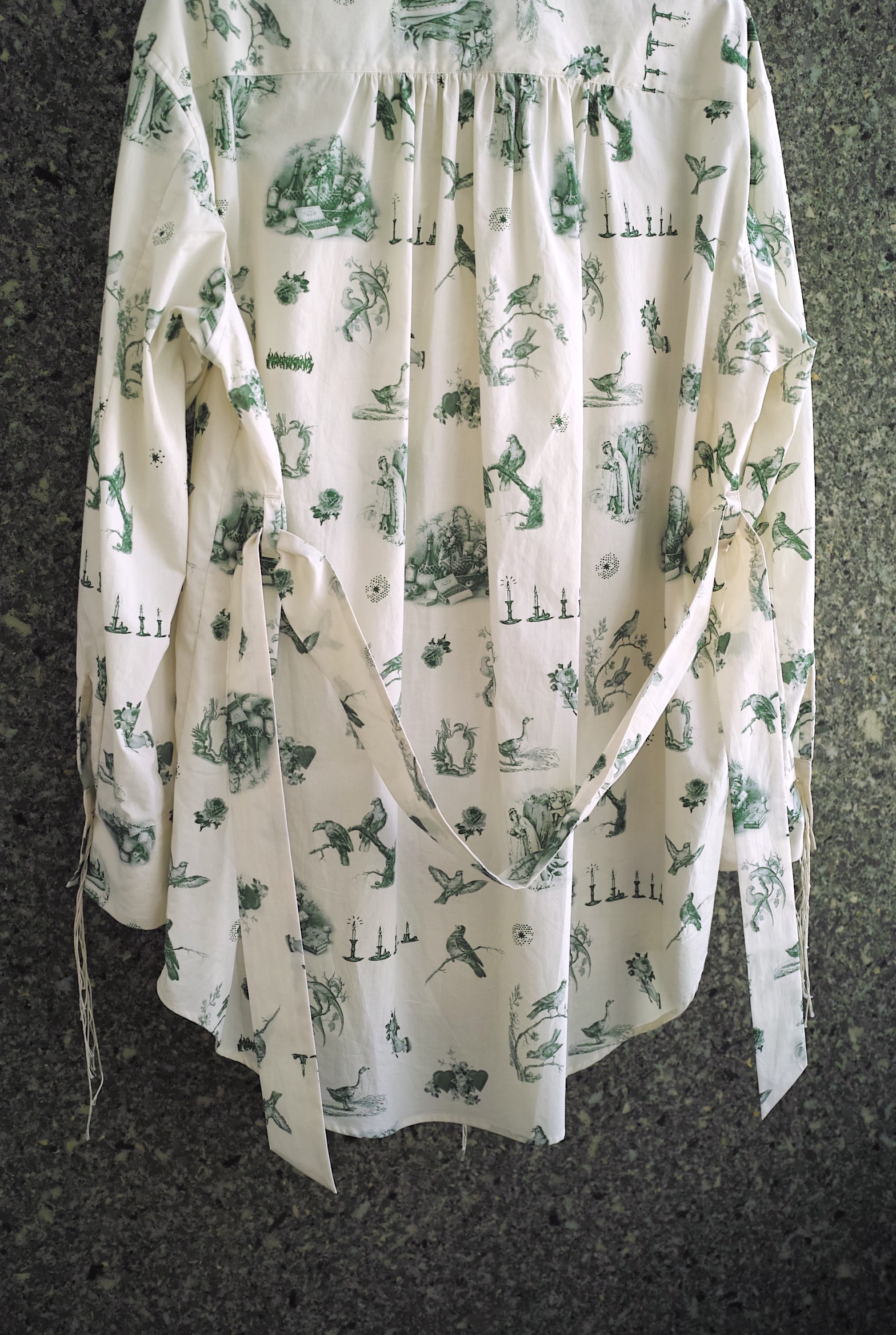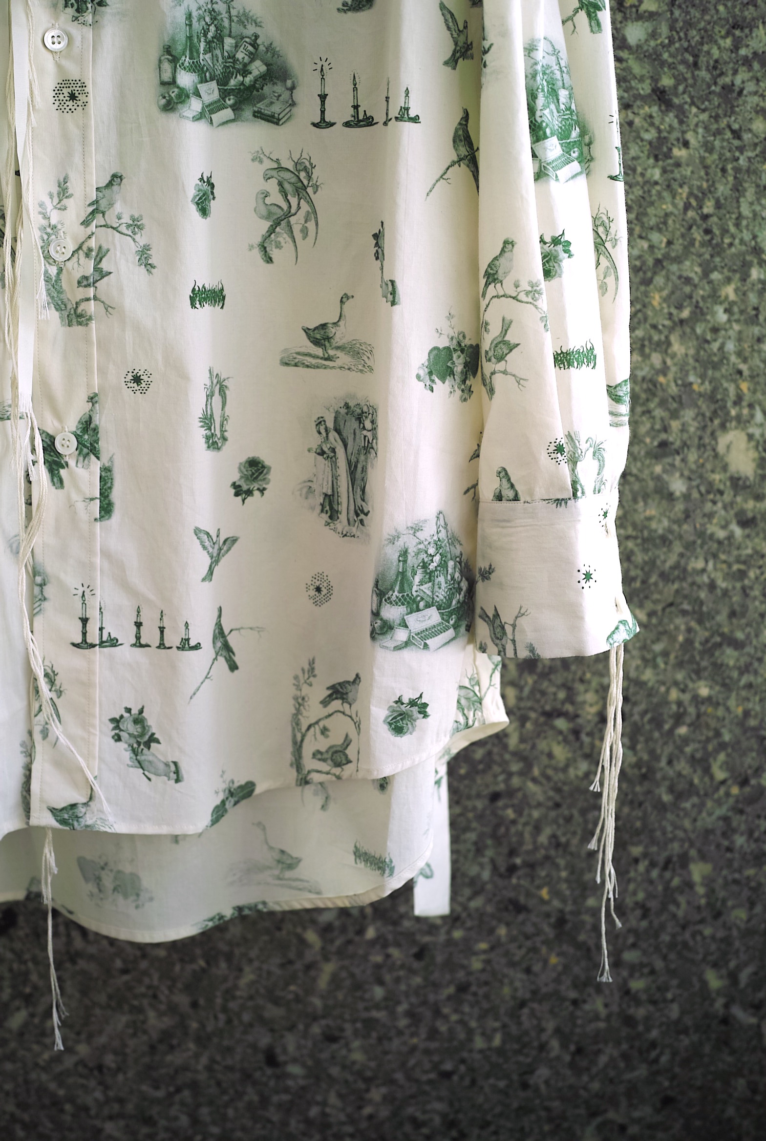 超長綿のMidorikawaオリジナルシーツクロスで仕立てたワークシャツ。 今シーズンはアイボリーボディに色々な鳥や蝋燭がプリントされた柄”CANDLE”。 ハーフコートのような緩いシルエット、共地のベルト付き。 シャツの上からレイヤードするオーガンジーのプルオーバーもセットになります。 ~~~~~~~~~~~~~~~~~~~~~~~ BODY:100% COTTON ORGANDY:100% COTTON COLOR:CANDLE サイズ感のイメージや素材の事など、お気軽に電話/メールにてご質問ください。