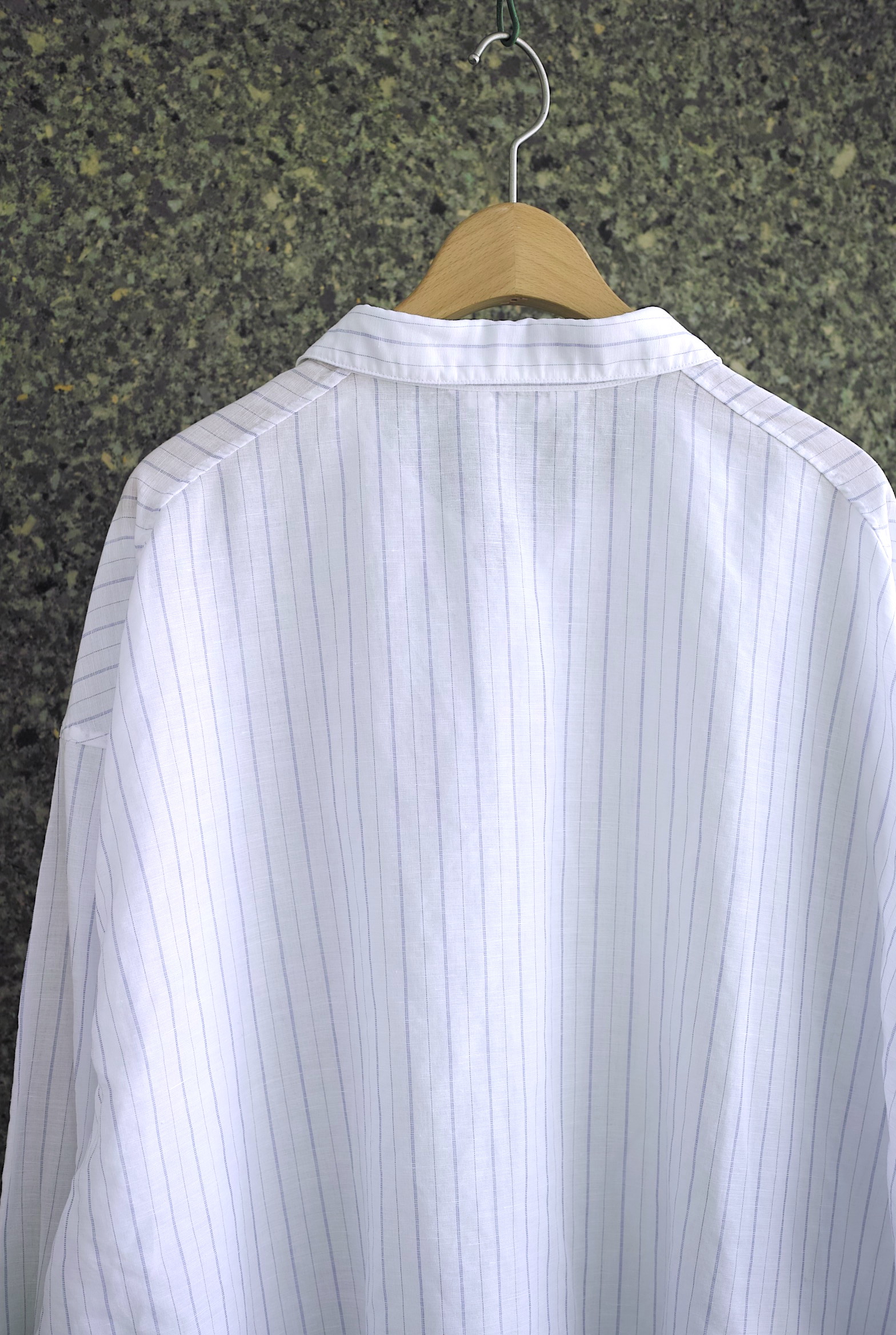 ここ数シーズン継続しているオーバーサイズの形を落とし込んだリネンストライプシャツ。 肩幅、身幅ともにたっぷりなボリュームがあり、体を覆うようなイメージのサイズ感になります。 ~~~~~~~~~~~~~~~~~~~~~~~ BODY:45% COTTON/55% LINEN COLOR:BLUE サイズ感のイメージや素材の事など、お気軽に電話/メールにてご質問ください。