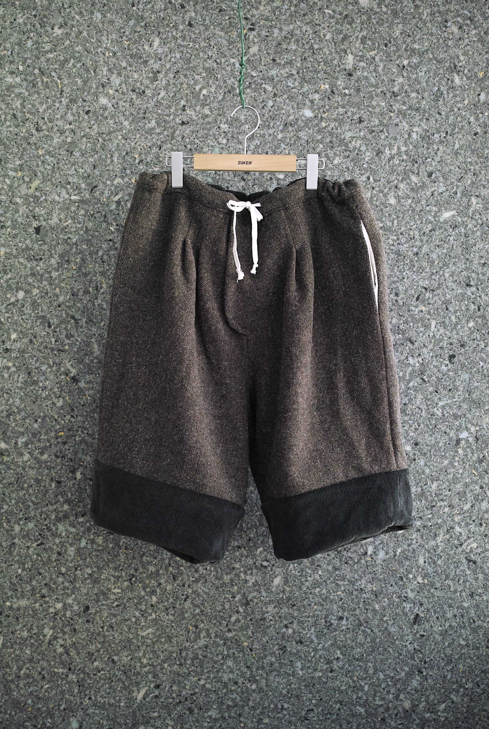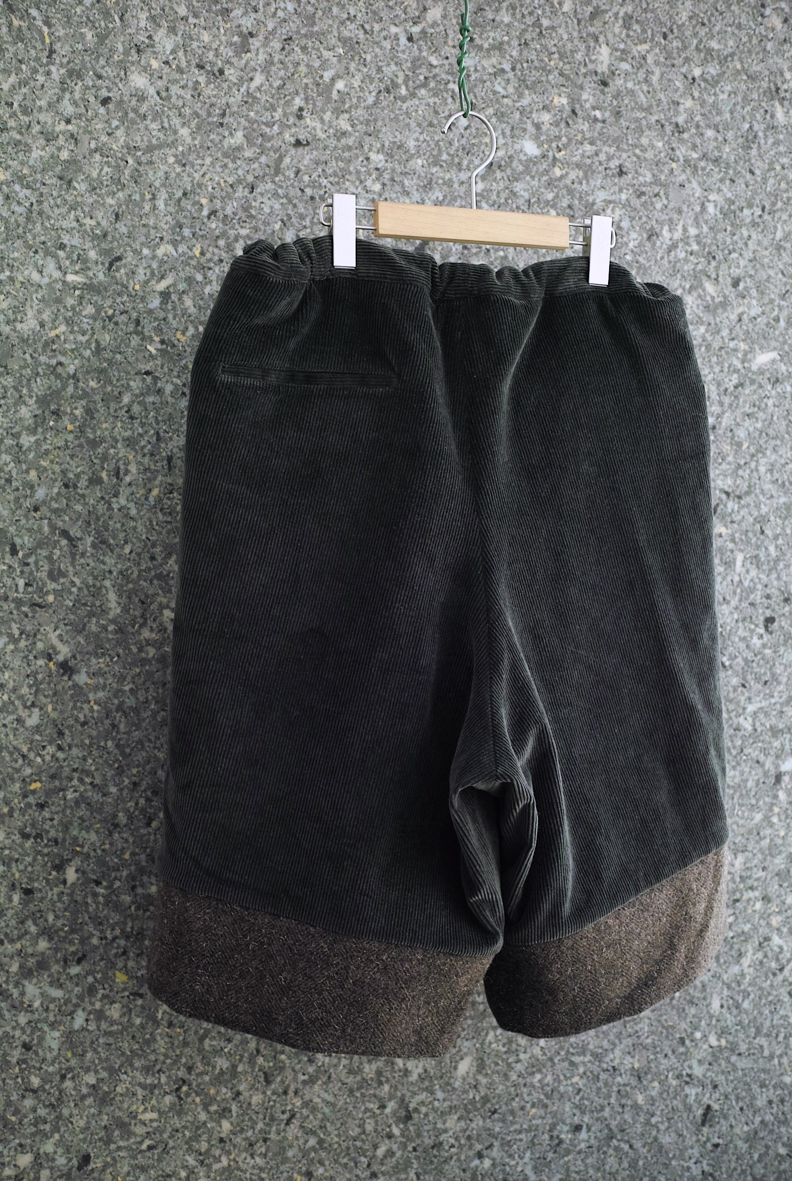 静岡/天龍社で織られているコーデュロイ×愛知/尾州産のケンピウール、オリーブカラーの2つの生地がリバシーブルになったハーフパンツ。