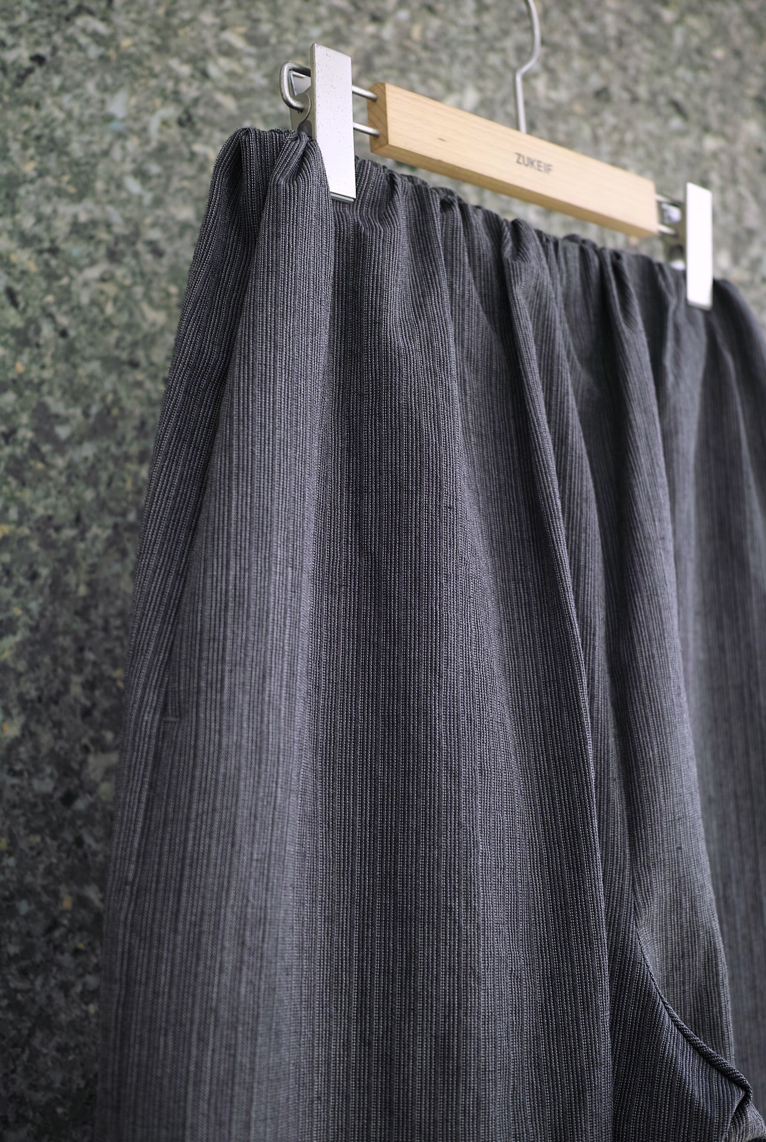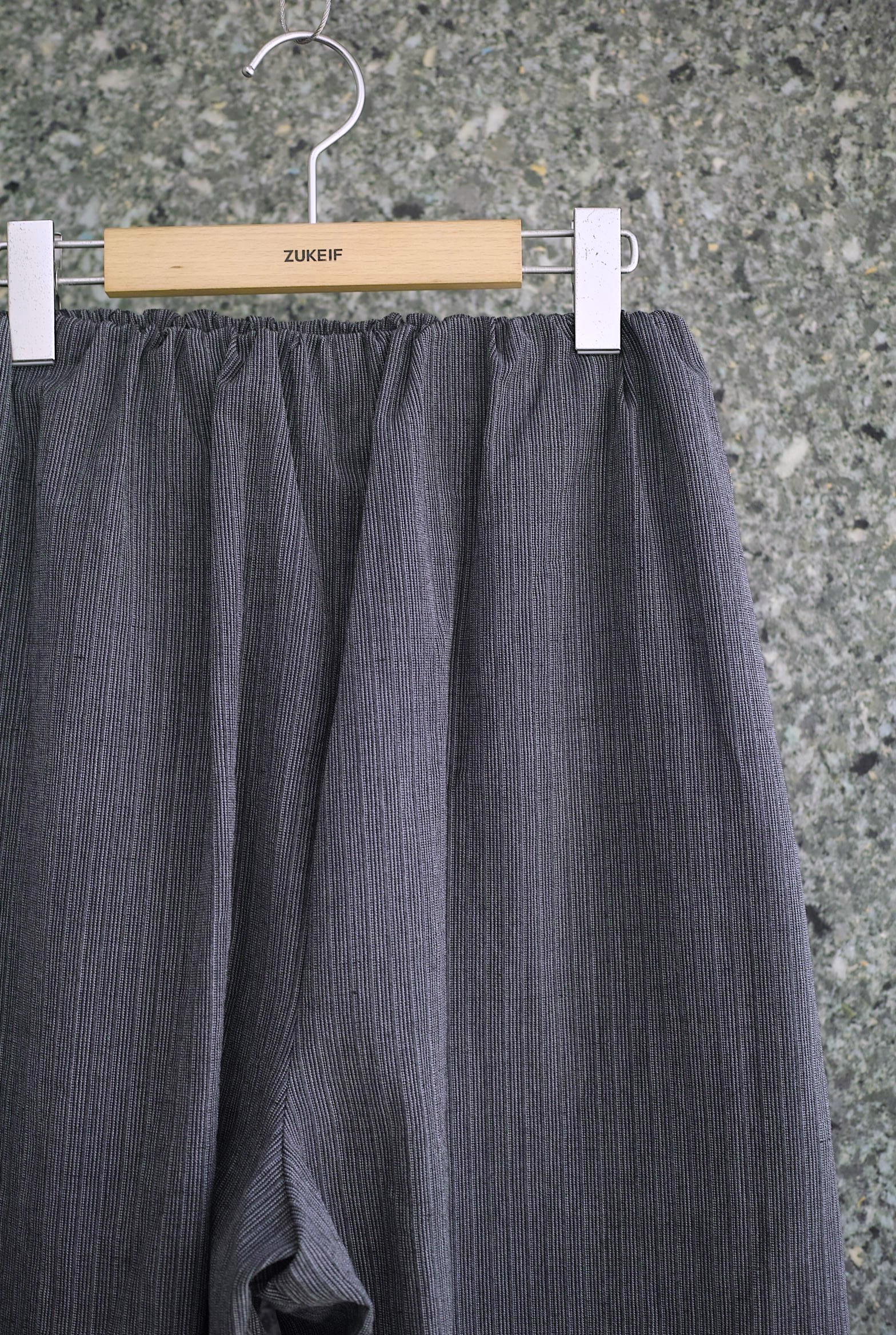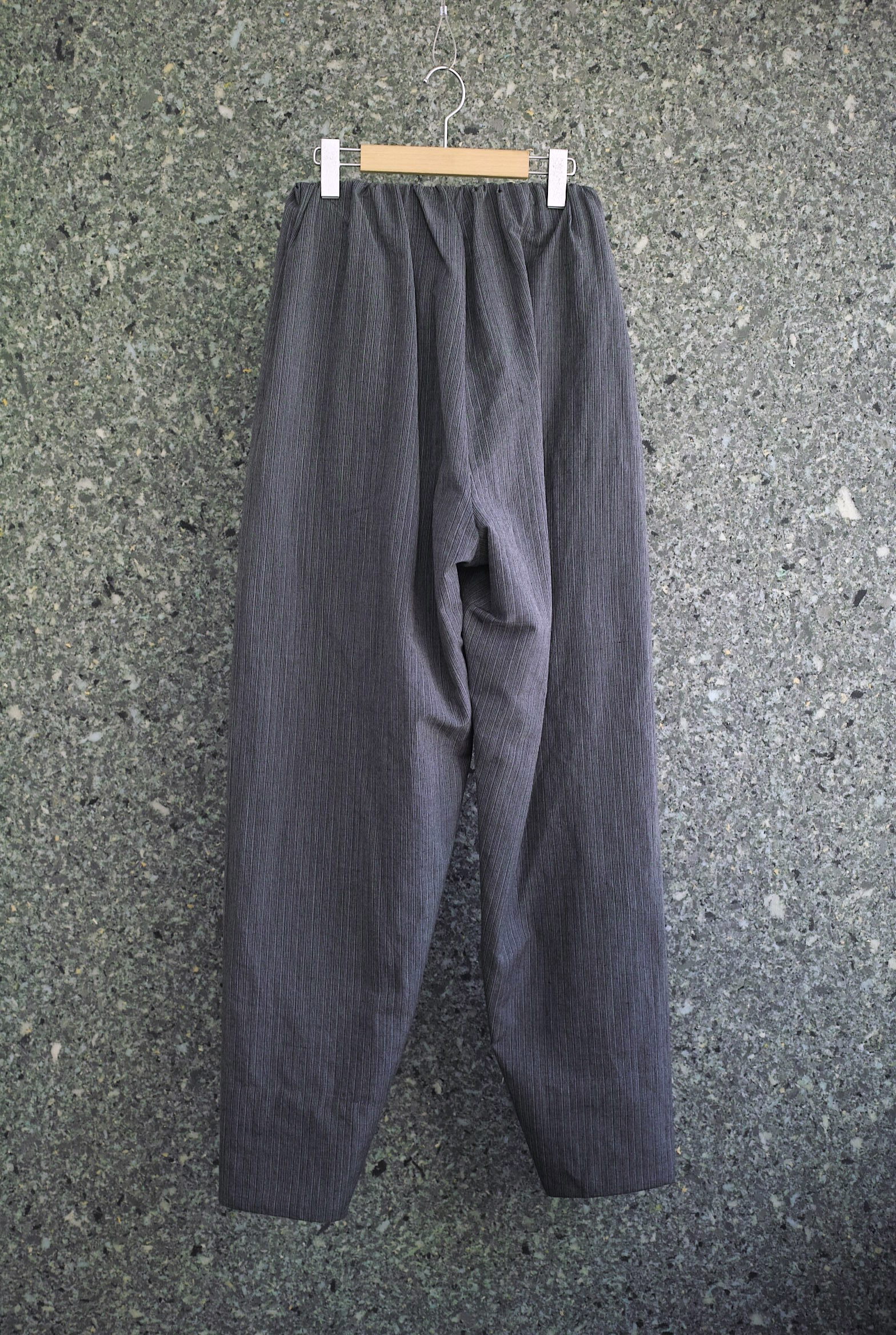 昨年のコレクションで作っていたバランスの良いウエストゴムのイージーパンツを、アウトラインは触らずに内側に強めのテーパードを掛け、裾にグシャッと溜まるようにレングスを長くした新しいシルエットのパンツになります。 生地はイタリア”LYRIA社”のウール/ラミーストライプ、独特なシャリ感とドレープの美しい生地。 裾15cmにナチュラルカラーの綿裏地が付きます。 ぼんやりと綺麗で、でもどこか収まりの悪さを感じるような面白いパンツ。 ~~~~~~~~~~~~~~~~~~~~~~~ BODY:67%WOOL 67%RAMIE LINING:100%CUPRA COLOR:GREY サイズ感のイメージや素材の事など、お気軽に電話/メールにてご相談ください。
