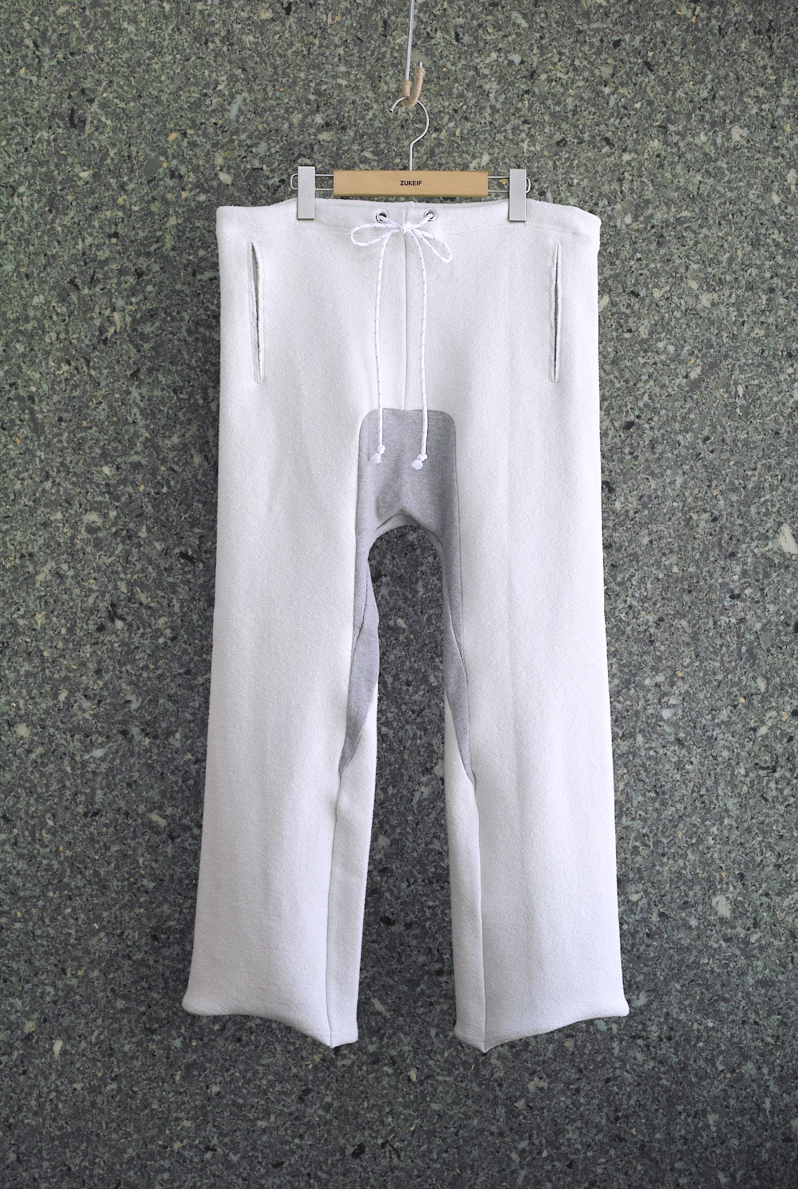 CLASSのスウェット生地『ゼロ飛び裏毛』密度が高く厚みのあるズシッとしたスウェットらしさを感じさる表情にふっくらと優しい肌当たり。 こちらを裏使いしています。 大きなウエストをギュッと絞り穿くスウェットのパンツ。股がもたつく変形したリブ編みのガゼットクロッチ。 スウェットらしからぬシャープで綺麗なシルエットは絶妙で奇妙なバランスを感じます。 ~~~~~~~~~~~~~~~~~~~~~~~ BODY:100%COTTON COLOR:GREY サイズ感のイメージや素材の事など、お気軽に電話/メールにてご相談ください。