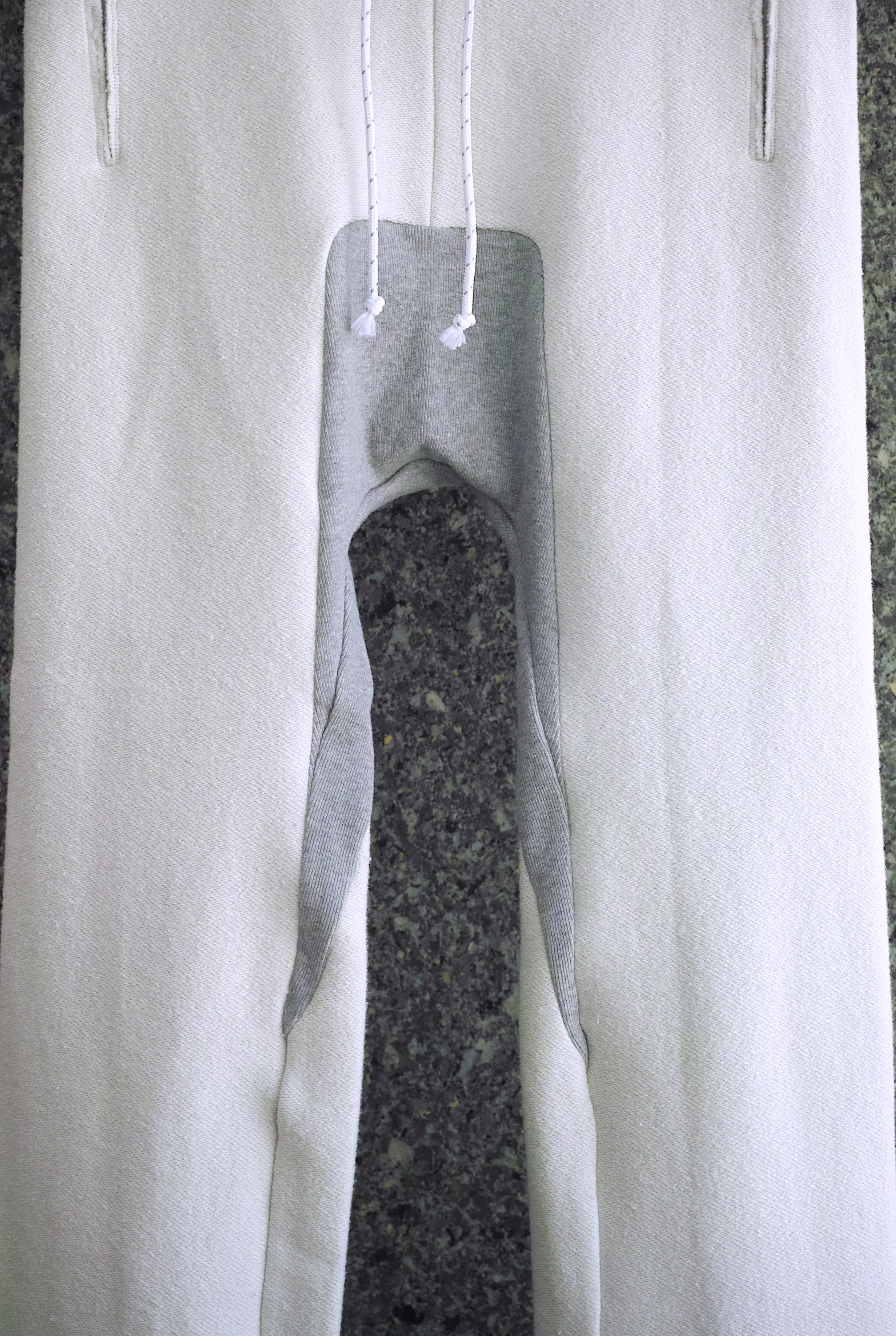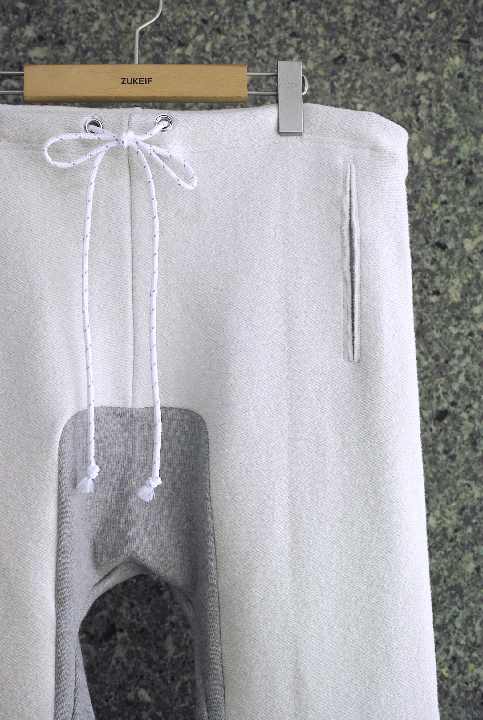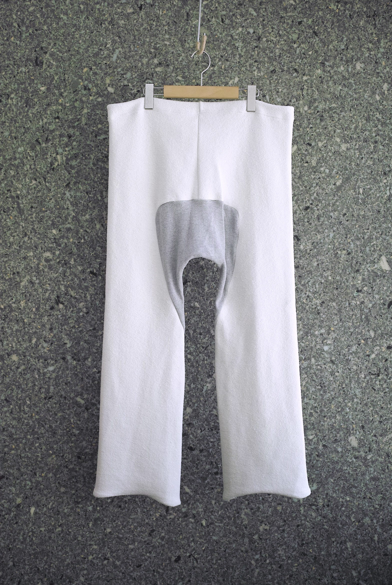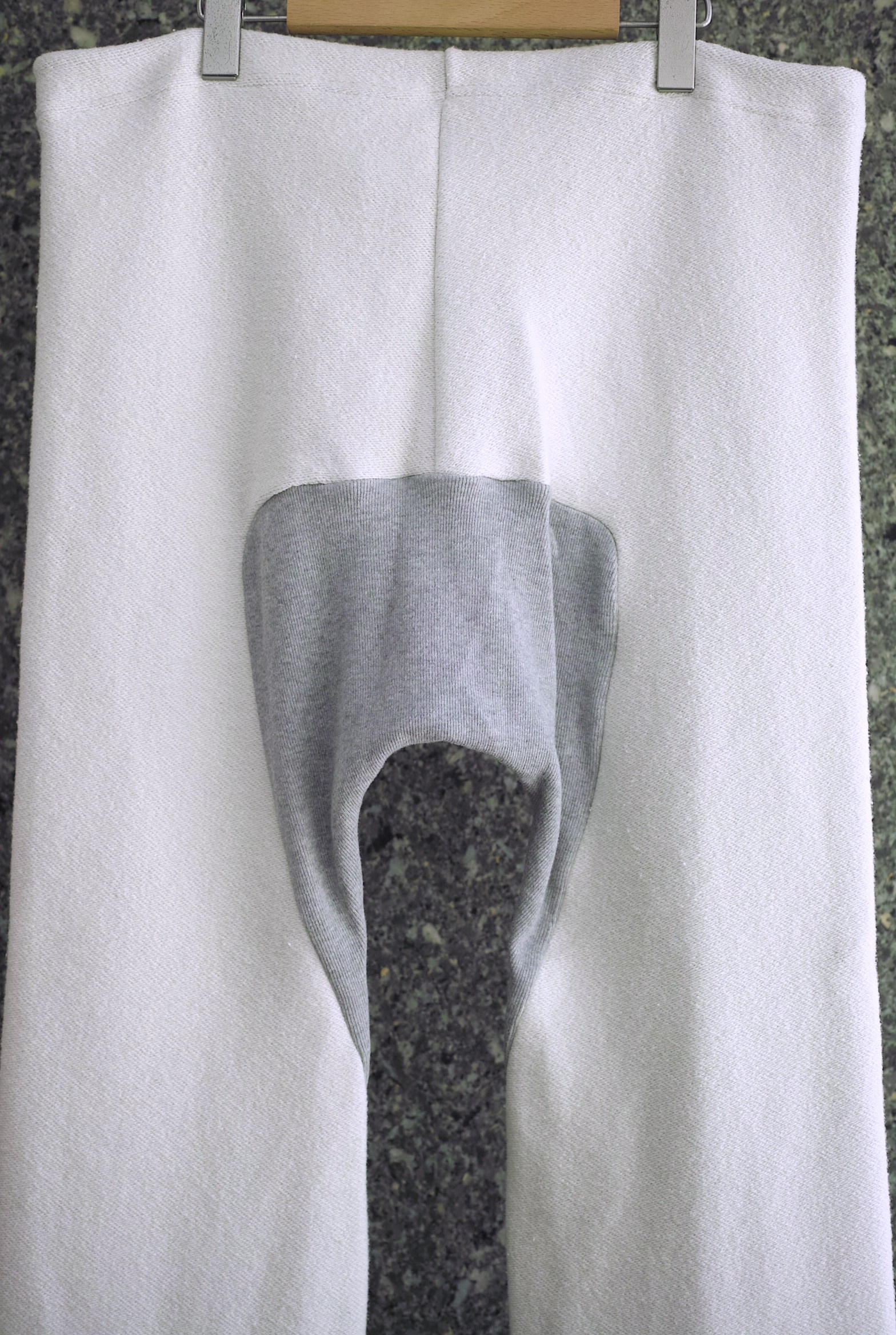 大きなウエストをギュッと絞り穿くスウェットのパンツ。股がもたつく変形したリブ編みのガゼットクロッチ。