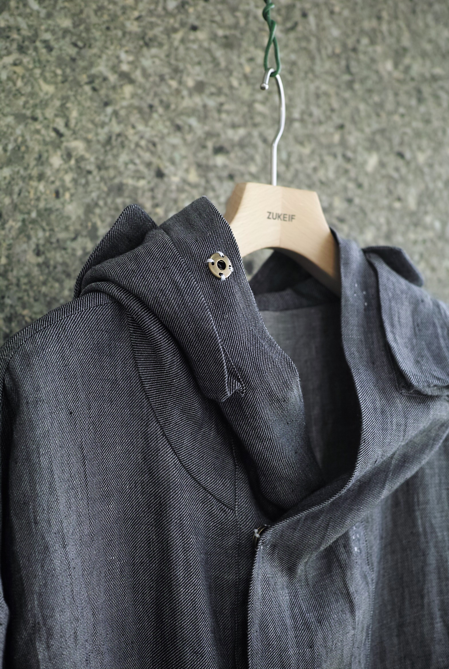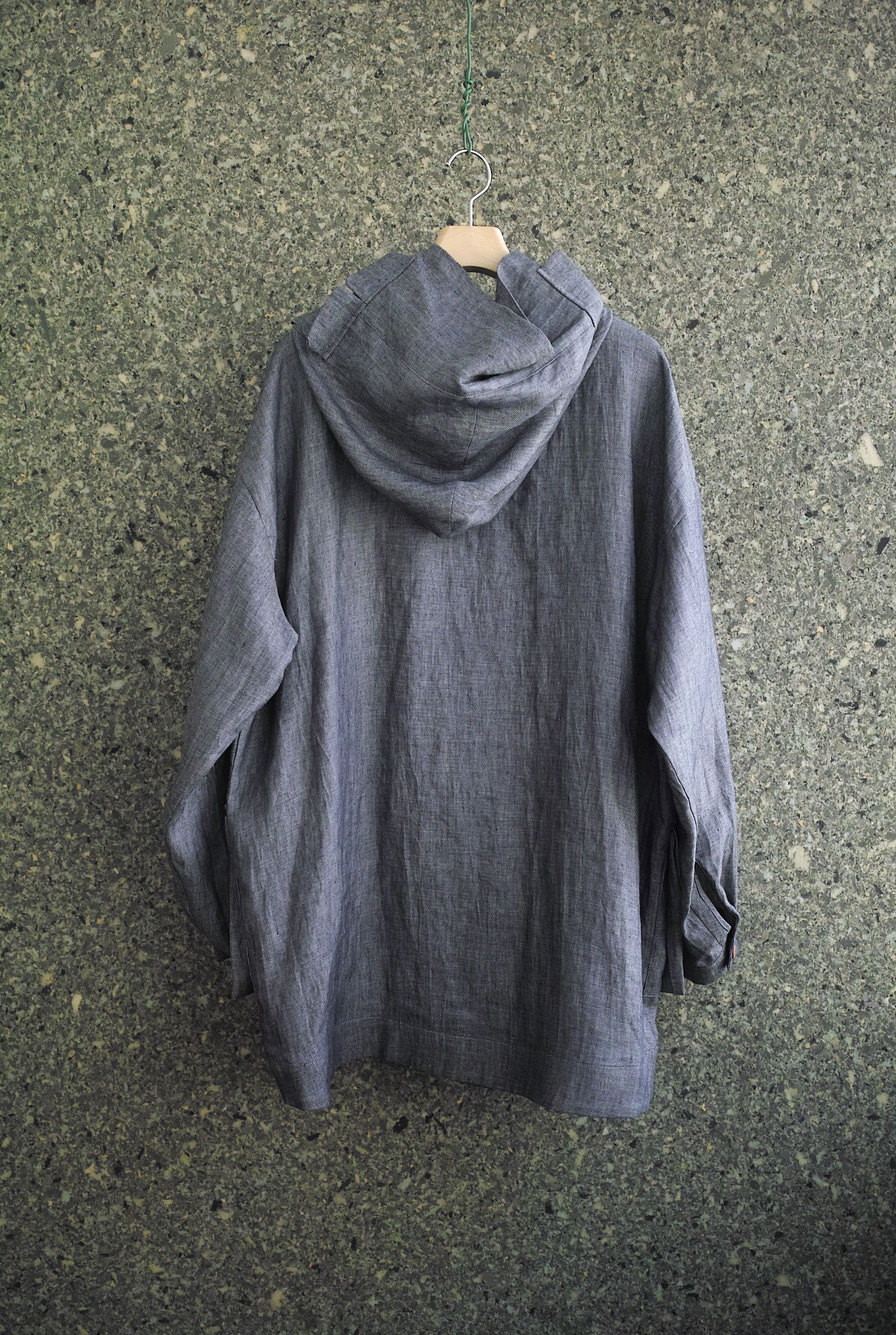 トロッと柔らかなリネンデニム生地で仕立てたお尻が隠れるくらいのハーフコート。